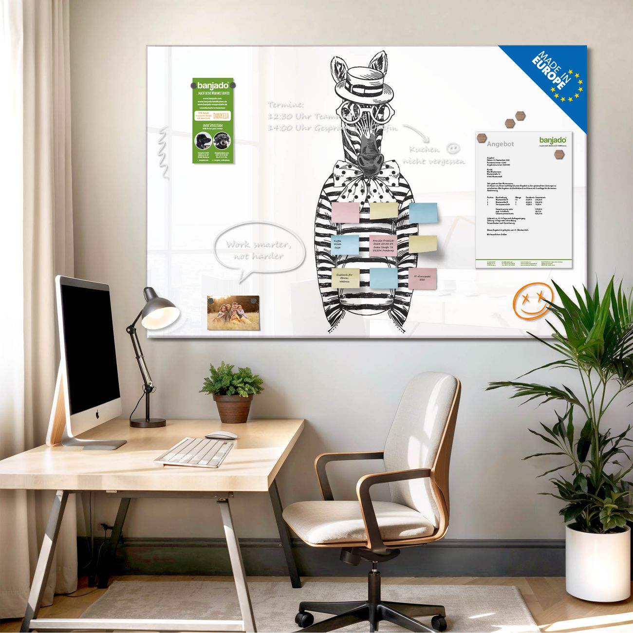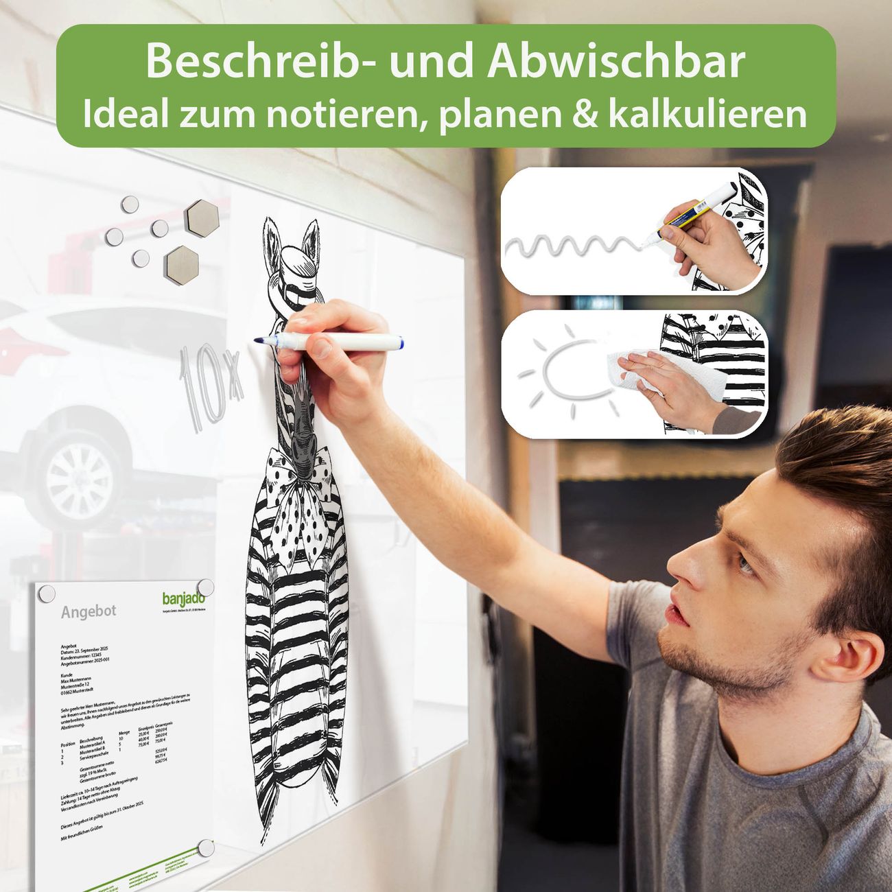 Jede Glas Magnettafel wird in unserer Werkstatt von Hand gefertigt und sorgfältig geprüft. So erhalten Sie ein echtes Qualitätsprodukt, das Funktion und Ästhetik perfekt vereint.?? Warum banjado?