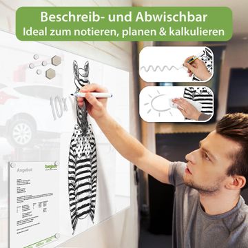 Auf der glatten Glasoberfläche lassen sich Termine, Rezepte oder Notizen ganz einfach mit Kreidestiften festhalten und rückstandslos entfernen. Starke Neodym-Magnete halten Ihre wichtigsten Erinnerungen sicher an Ort und Stelle. So entsteht Ihre ganz persönliche Ideenwand - jeden Tag neu.