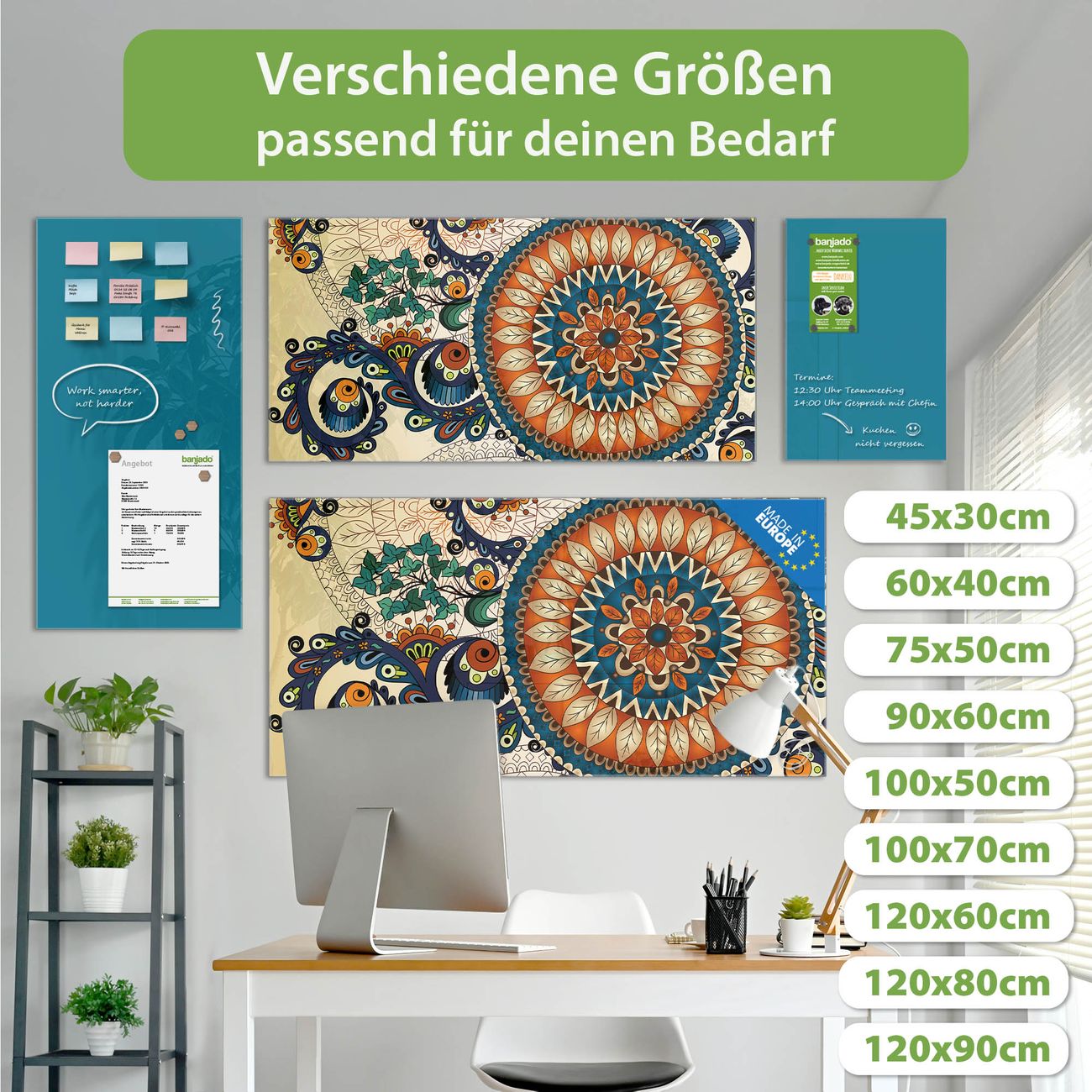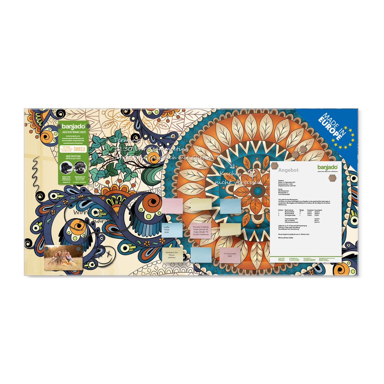 Ein Stück Design, das Ihren Alltag organisiert. Schreiben, heften, inspirieren - alles an einem Ort. Qualität, die man spürt. Montage leicht gemacht. Handwerk mit Herz - veredelt in Sachsen. Einzigartiges Design mit Motiv Motiv Modernes Mandala Beschreibbare Glasoberfläche, leicht zu reinigen Starke Magnetkraft durch Stahlrückwand Inklusive 4 Neodym-Magneten Flexible Montageoptionen Handveredelt in Sachsen - Qualität, die bleibt