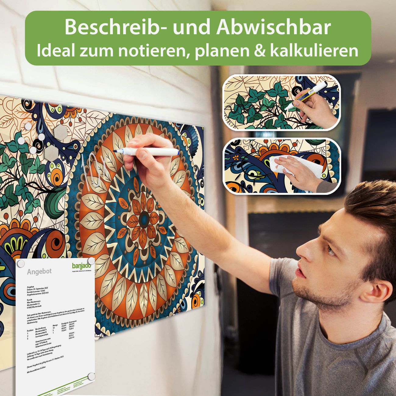 Jede Glas Magnettafel wird in unserer Werkstatt von Hand gefertigt und sorgfältig geprüft. So erhalten Sie ein echtes Qualitätsprodukt, das Funktion und Ästhetik perfekt vereint.?? Warum banjado?