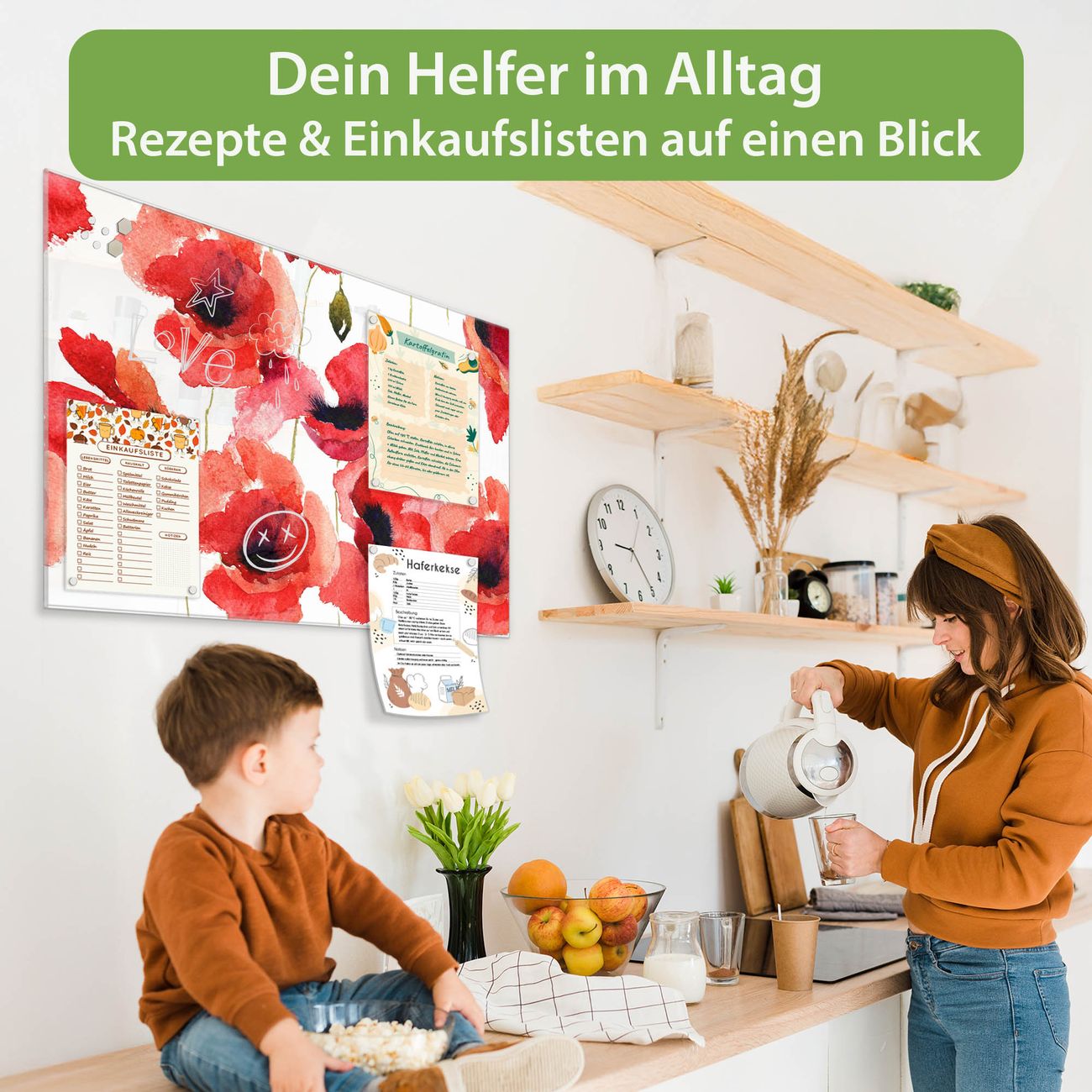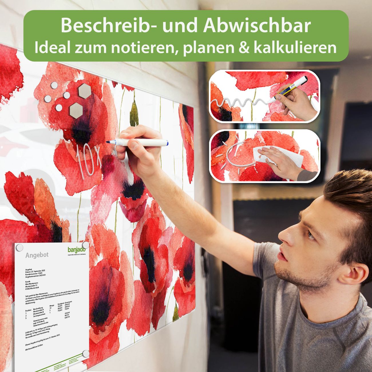 Ein Stück Design, das Ihren Alltag organisiert. Schreiben, heften, inspirieren - alles an einem Ort. Qualität, die man spürt. Montage leicht gemacht. Handwerk mit Herz - veredelt in Sachsen. Einzigartiges Design mit Motiv Motiv Mohn Aquarell Beschreibbare Glasoberfläche, leicht zu reinigen Starke Magnetkraft durch Stahlrückwand Inklusive 4 Neodym-Magneten Flexible Montageoptionen Handveredelt in Sachsen - Qualität, die bleibt