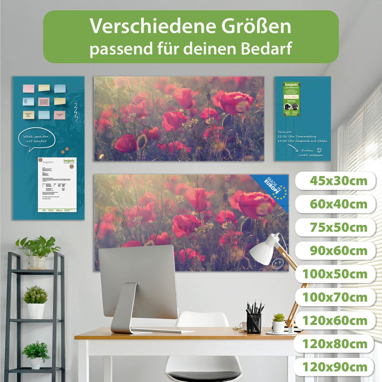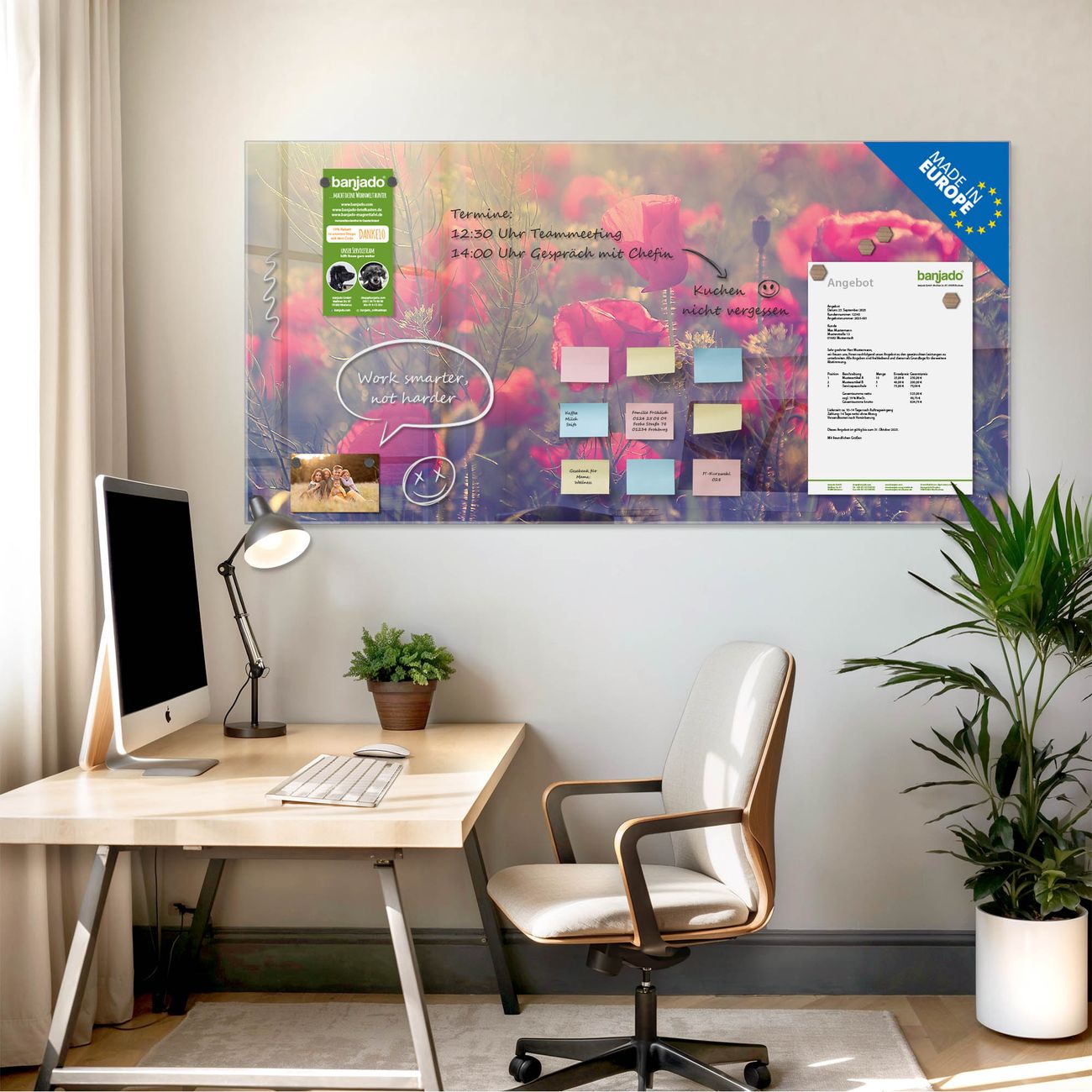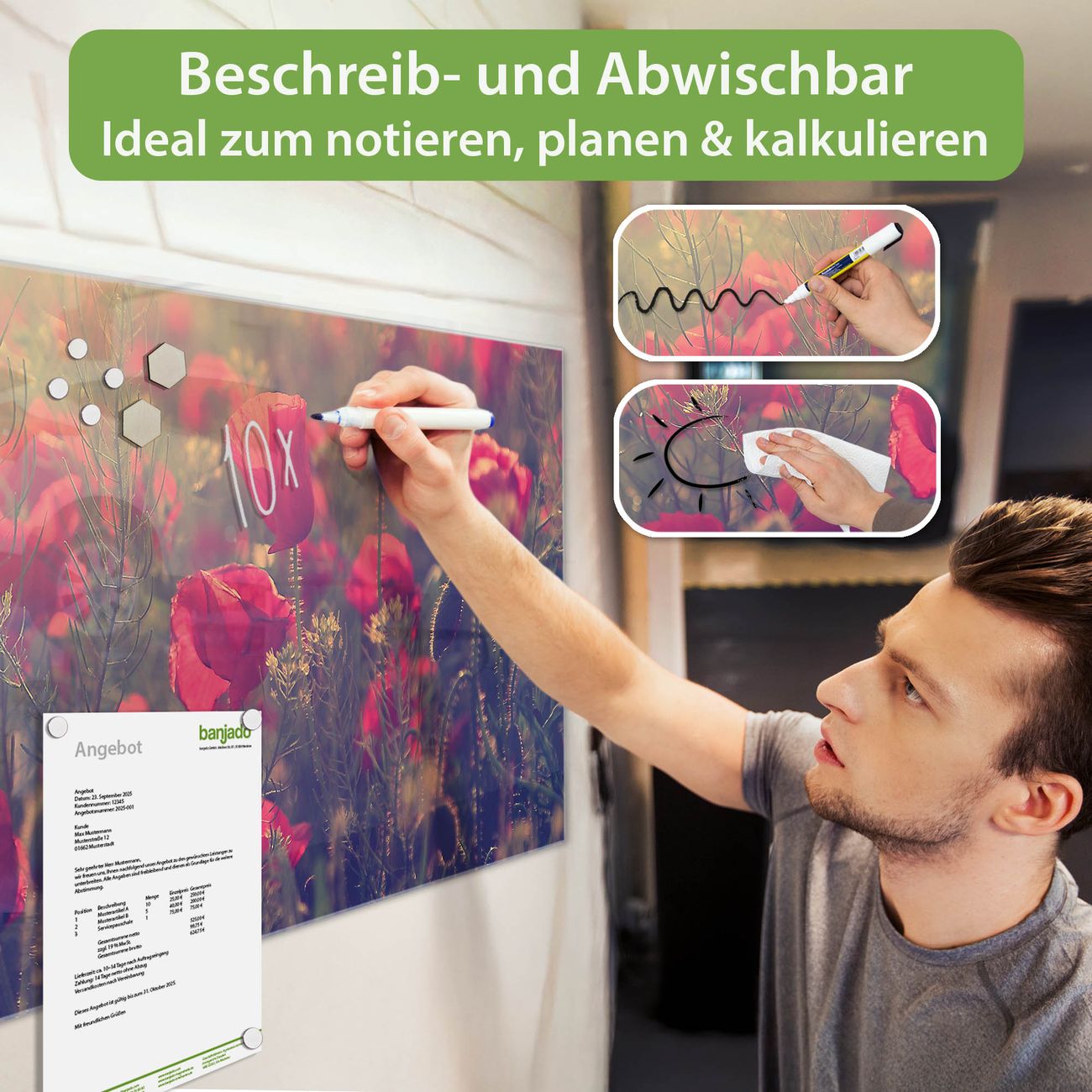 Jede Glas Magnettafel wird in unserer Werkstatt von Hand gefertigt und sorgfältig geprüft. So erhalten Sie ein echtes Qualitätsprodukt, das Funktion und Ästhetik perfekt vereint.?? Warum banjado?