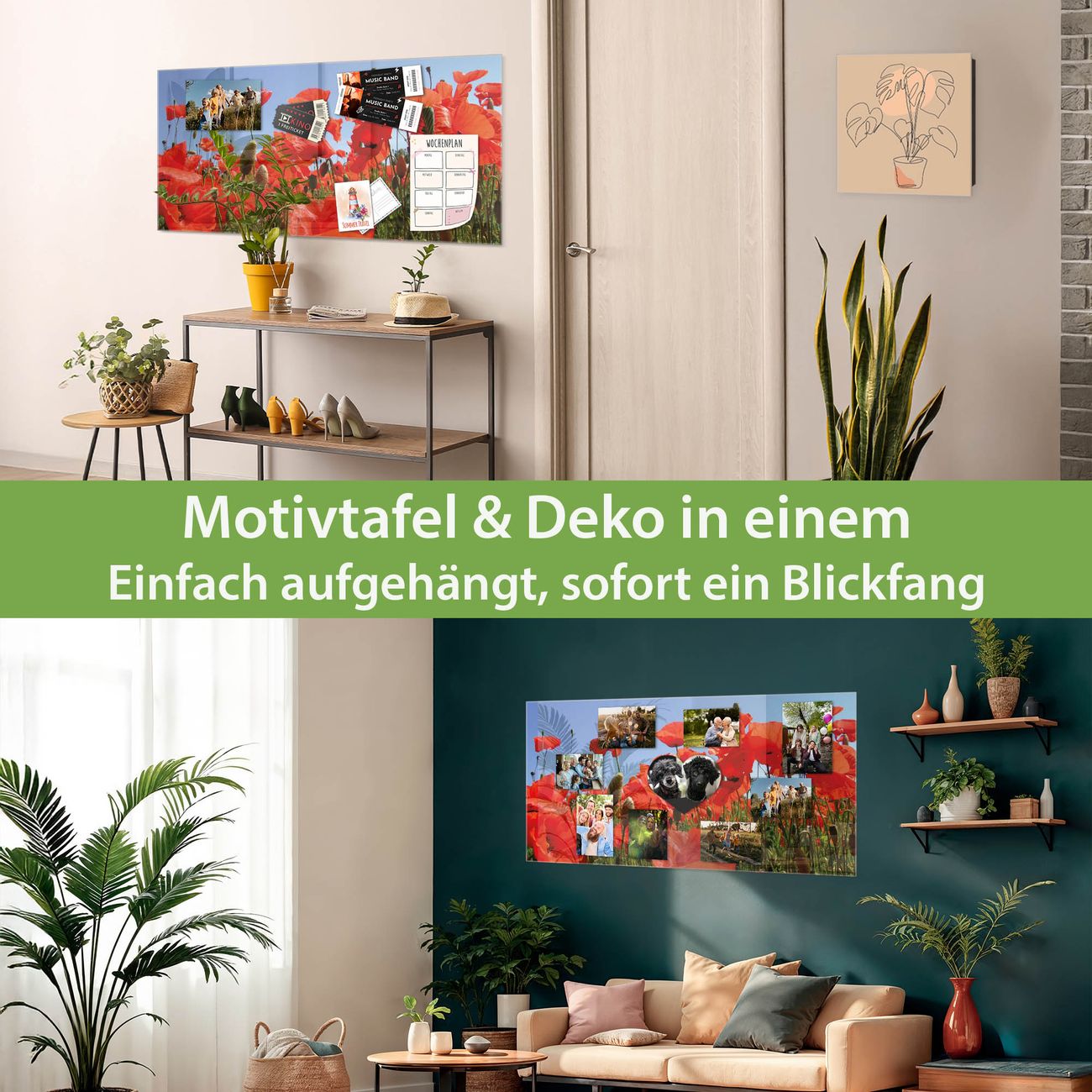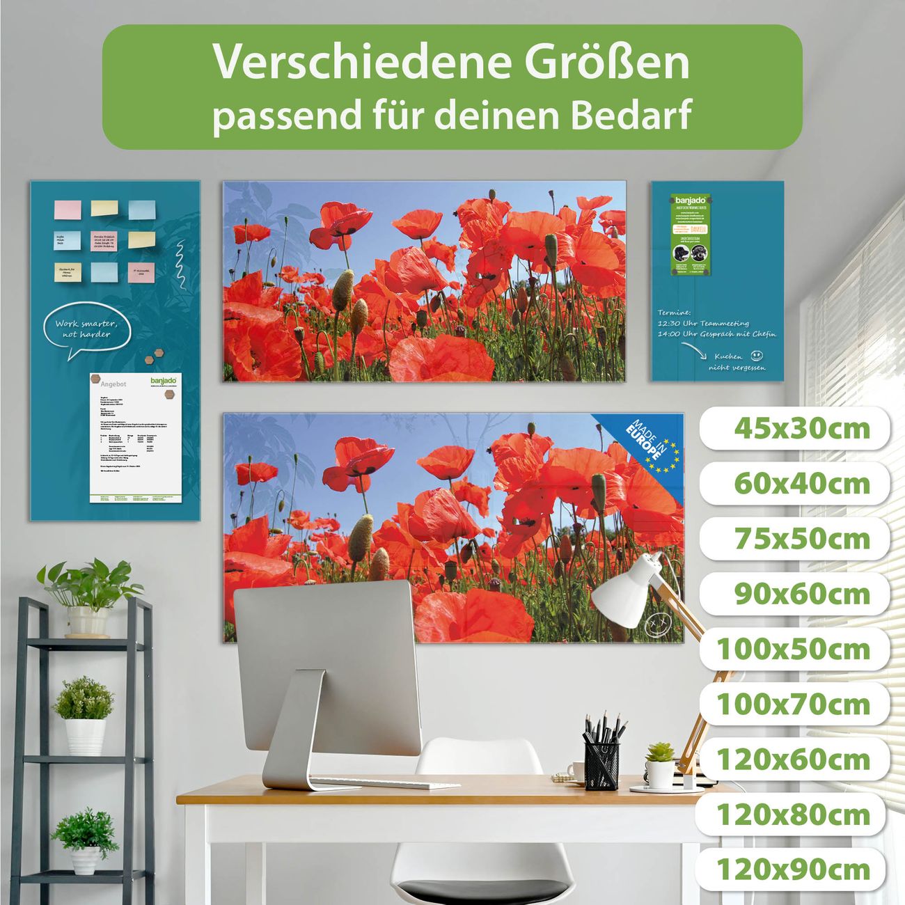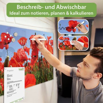 Die banjado Glas Magnettafel mit dem Motiv Motiv Mohnblumen verbindet Funktionalität mit Stil. Sie ersetzt das Zettelchaos durch klare Strukturen und bringt dabei eine warme, natürliche Atmosphäre in Ihr Zuhause. Ob im Büro, in der Küche oder im Eingangsbereich - dieses Design-Board zieht Blicke an und sorgt für Ordnung mit Charakter.