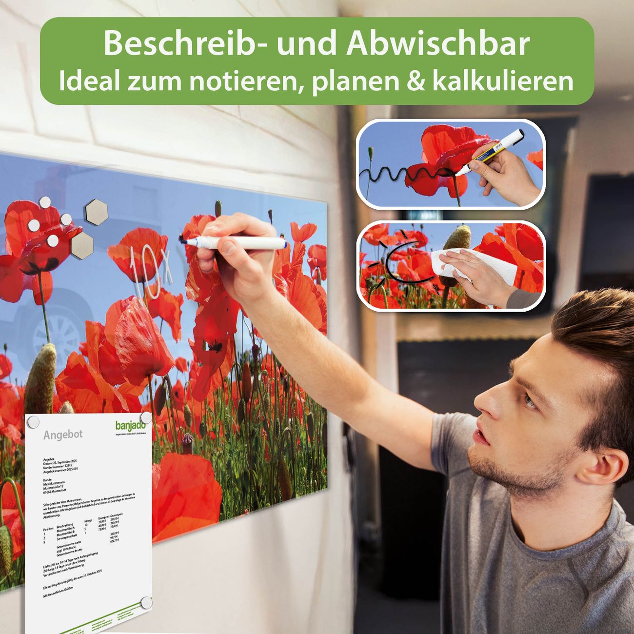 Jede Glas Magnettafel wird in unserer Werkstatt von Hand gefertigt und sorgfältig geprüft. So erhalten Sie ein echtes Qualitätsprodukt, das Funktion und Ästhetik perfekt vereint.?? Warum banjado?
