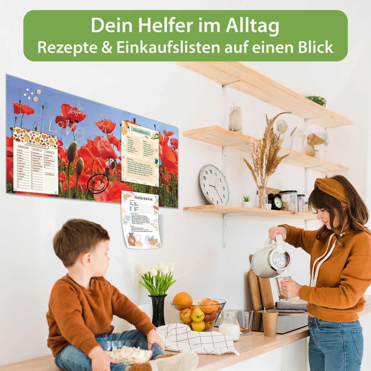 Ein Stück Design, das Ihren Alltag organisiert. Schreiben, heften, inspirieren - alles an einem Ort. Qualität, die man spürt. Montage leicht gemacht. Handwerk mit Herz - veredelt in Sachsen. Einzigartiges Design mit Motiv Motiv Mohnblumen Beschreibbare Glasoberfläche, leicht zu reinigen Starke Magnetkraft durch Stahlrückwand Inklusive 4 Neodym-Magneten Flexible Montageoptionen Handveredelt in Sachsen - Qualität, die bleibt