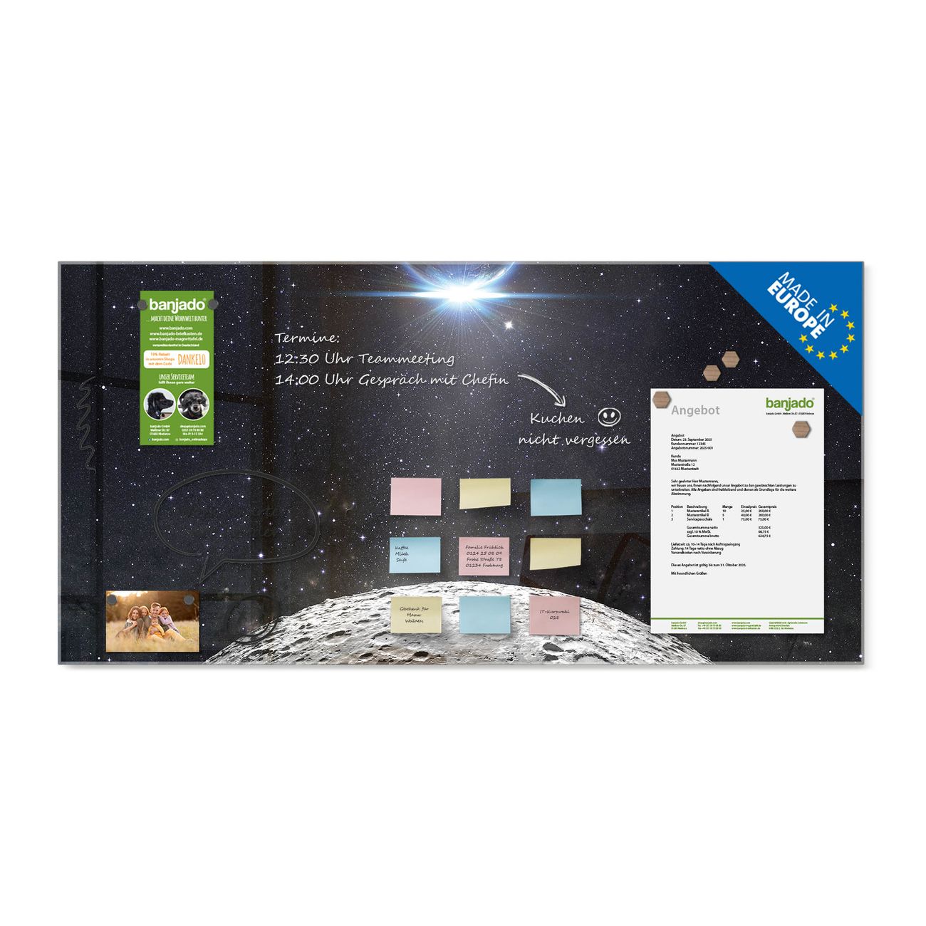 Ein Stück Design, das Ihren Alltag organisiert. Schreiben, heften, inspirieren - alles an einem Ort. Qualität, die man spürt. Montage leicht gemacht. Handwerk mit Herz - veredelt in Sachsen. Einzigartiges Design mit Motiv Motiv Mondlandschaft Beschreibbare Glasoberfläche, leicht zu reinigen Starke Magnetkraft durch Stahlrückwand Inklusive 4 Neodym-Magneten Flexible Montageoptionen Handveredelt in Sachsen - Qualität, die bleibt