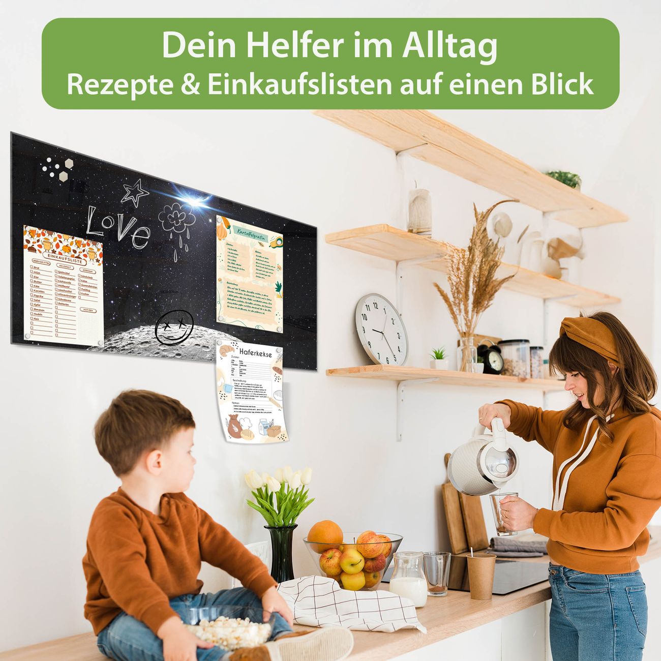 Auf der glatten Glasoberfläche lassen sich Termine, Rezepte oder Notizen ganz einfach mit Kreidestiften festhalten und rückstandslos entfernen. Starke Neodym-Magnete halten Ihre wichtigsten Erinnerungen sicher an Ort und Stelle. So entsteht Ihre ganz persönliche Ideenwand - jeden Tag neu.
