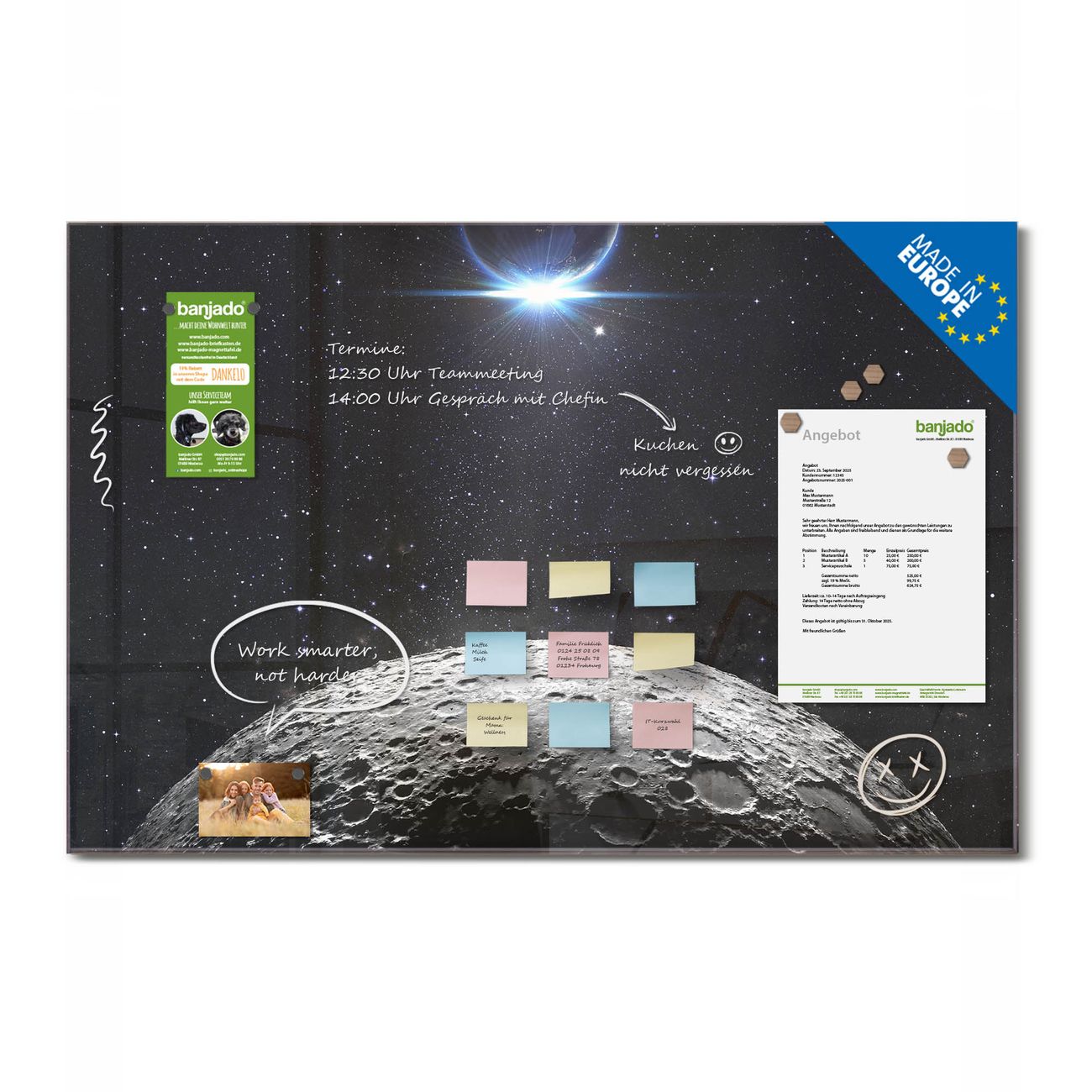 Ein Stück Design, das Ihren Alltag organisiert. Schreiben, heften, inspirieren - alles an einem Ort. Qualität, die man spürt. Montage leicht gemacht. Handwerk mit Herz - veredelt in Sachsen. Einzigartiges Design mit Motiv Motiv Mondlandschaft Beschreibbare Glasoberfläche, leicht zu reinigen Starke Magnetkraft durch Stahlrückwand Inklusive 4 Neodym-Magneten Flexible Montageoptionen Handveredelt in Sachsen - Qualität, die bleibt