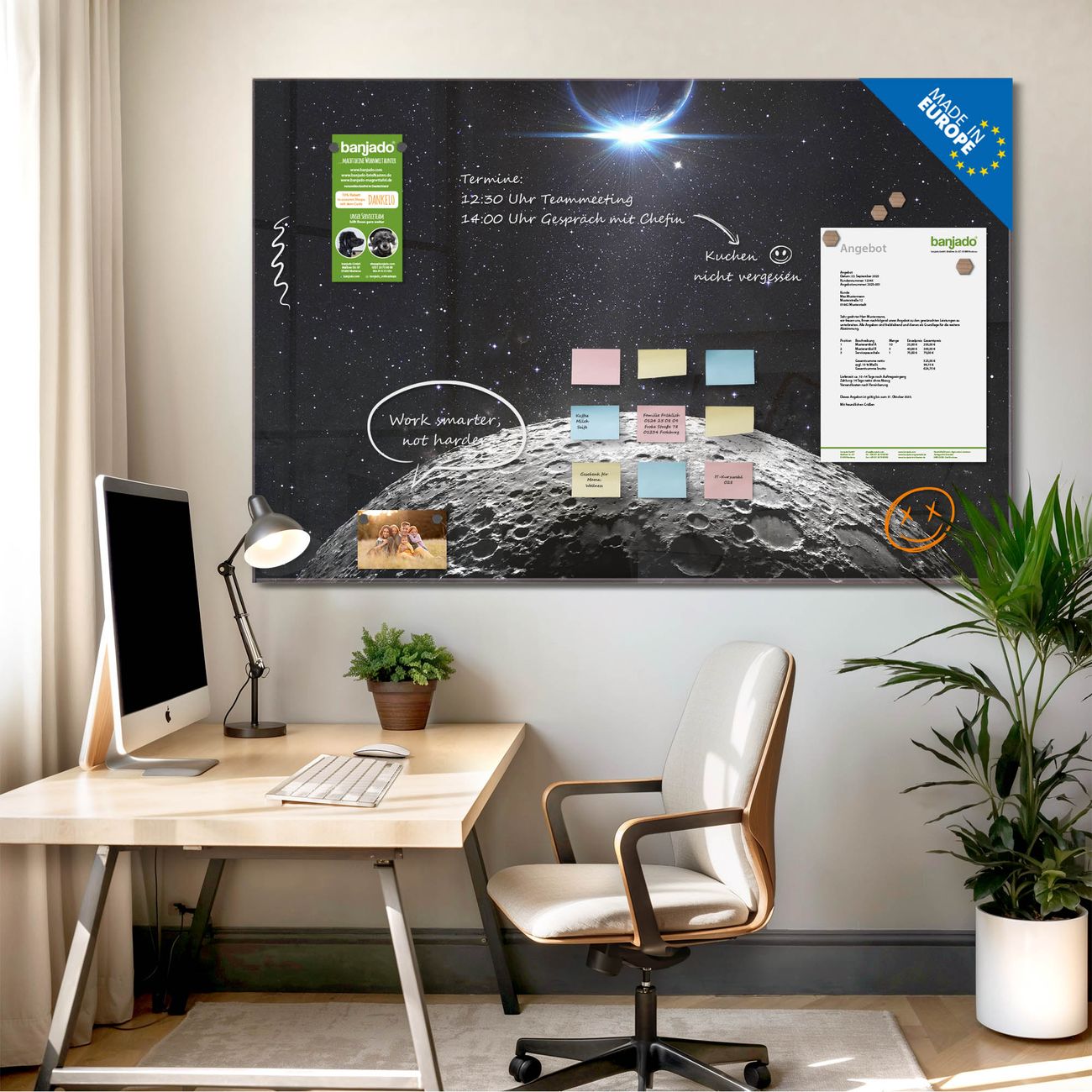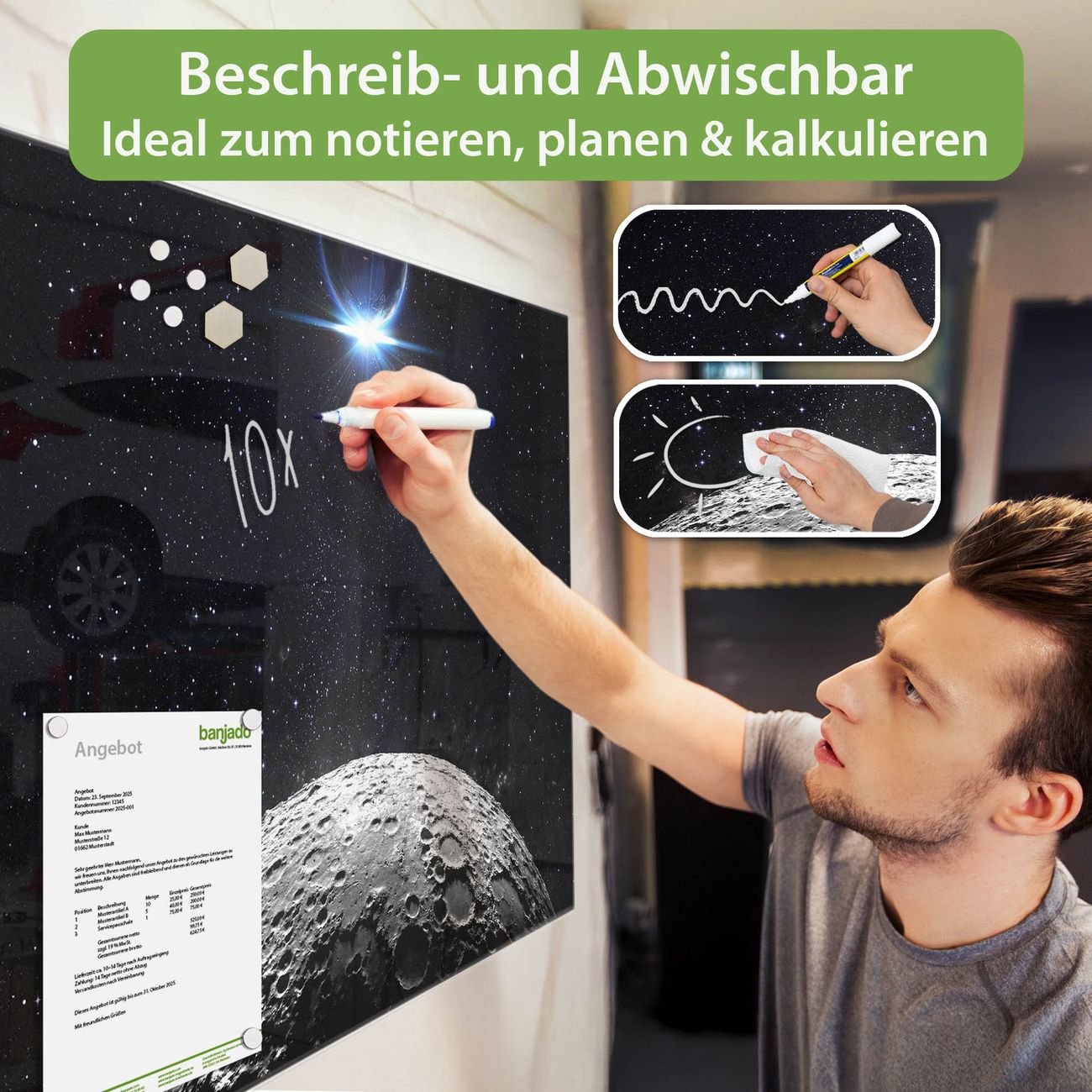 Jede Glas Magnettafel wird in unserer Werkstatt von Hand gefertigt und sorgfältig geprüft. So erhalten Sie ein echtes Qualitätsprodukt, das Funktion und Ästhetik perfekt vereint.?? Warum banjado?