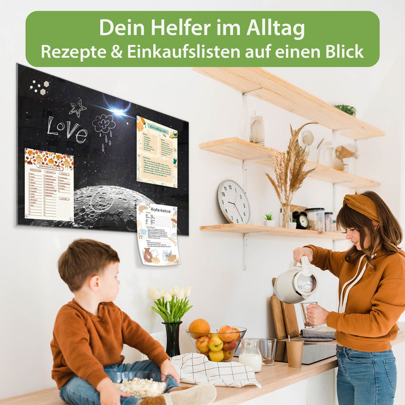 Auf der glatten Glasoberfläche lassen sich Termine, Rezepte oder Notizen ganz einfach mit Kreidestiften festhalten und rückstandslos entfernen. Starke Neodym-Magnete halten Ihre wichtigsten Erinnerungen sicher an Ort und Stelle. So entsteht Ihre ganz persönliche Ideenwand - jeden Tag neu.