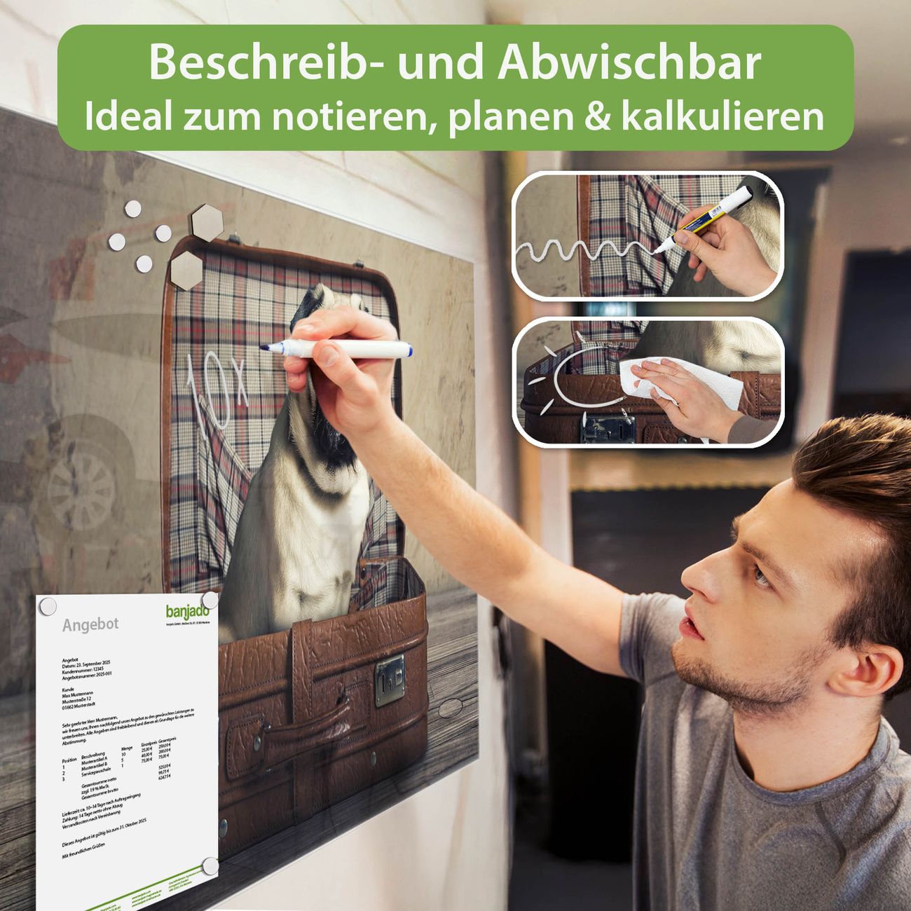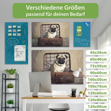 Die banjado Glas Magnettafel mit dem Motiv Motiv Mops im Koffer verbindet Funktionalität mit Stil. Sie ersetzt das Zettelchaos durch klare Strukturen und bringt dabei eine warme, natürliche Atmosphäre in Ihr Zuhause. Ob im Büro, in der Küche oder im Eingangsbereich - dieses Design-Board zieht Blicke an und sorgt für Ordnung mit Charakter.