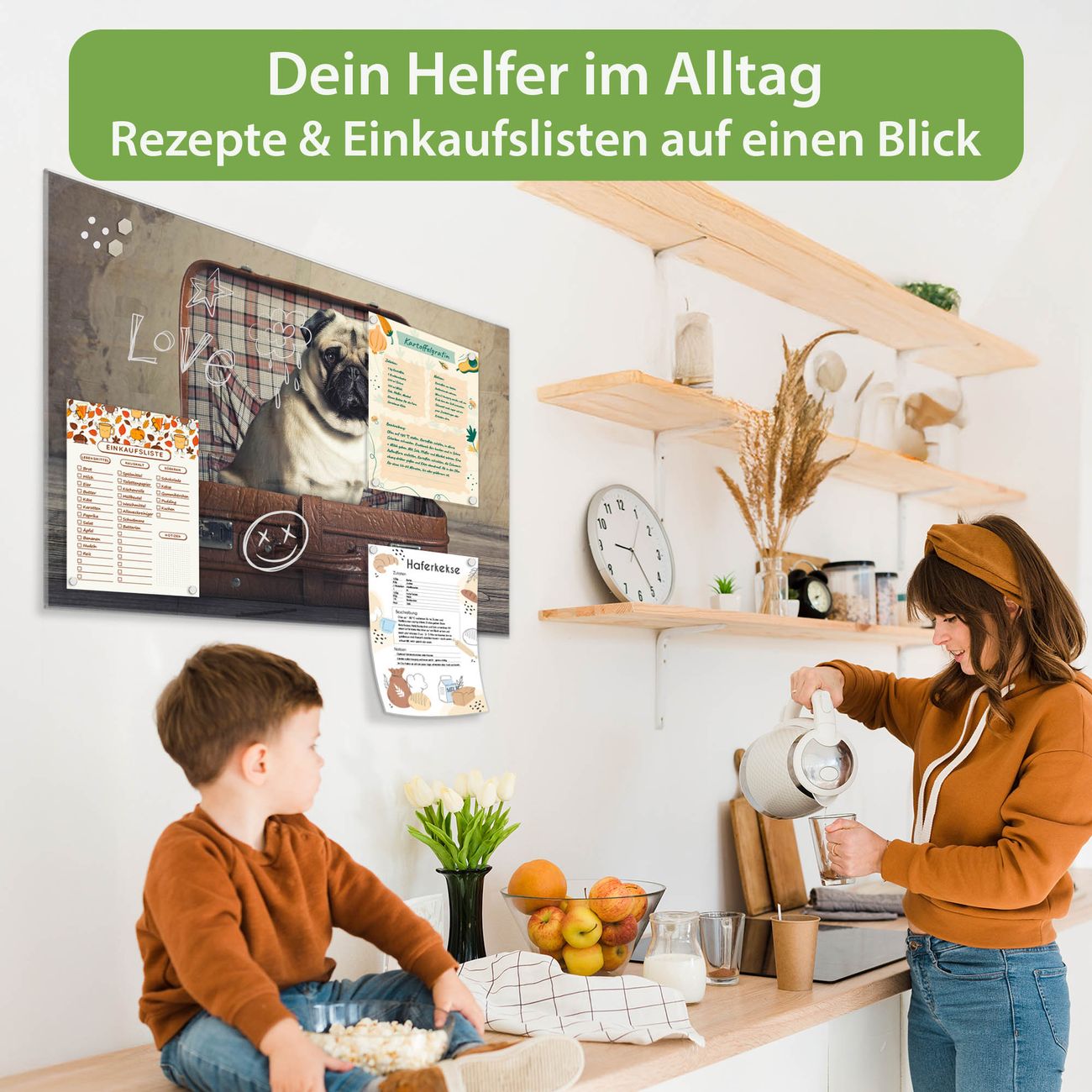 Ein Stück Design, das Ihren Alltag organisiert. Schreiben, heften, inspirieren - alles an einem Ort. Qualität, die man spürt. Montage leicht gemacht. Handwerk mit Herz - veredelt in Sachsen. Einzigartiges Design mit Motiv Motiv Mops im Koffer Beschreibbare Glasoberfläche, leicht zu reinigen Starke Magnetkraft durch Stahlrückwand Inklusive 4 Neodym-Magneten Flexible Montageoptionen Handveredelt in Sachsen - Qualität, die bleibt
