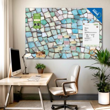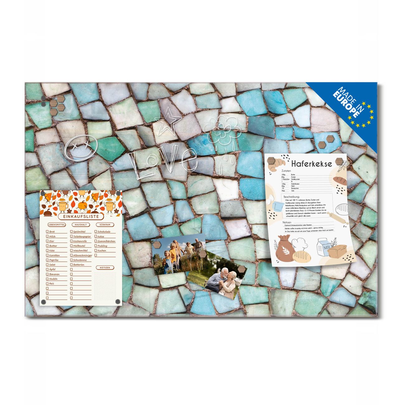 Ein Stück Design, das Ihren Alltag organisiert. Schreiben, heften, inspirieren - alles an einem Ort. Qualität, die man spürt. Montage leicht gemacht. Handwerk mit Herz - veredelt in Sachsen. Einzigartiges Design mit Motiv Motiv Mosaik Blau Beschreibbare Glasoberfläche, leicht zu reinigen Starke Magnetkraft durch Stahlrückwand Inklusive 4 Neodym-Magneten Flexible Montageoptionen Handveredelt in Sachsen - Qualität, die bleibt