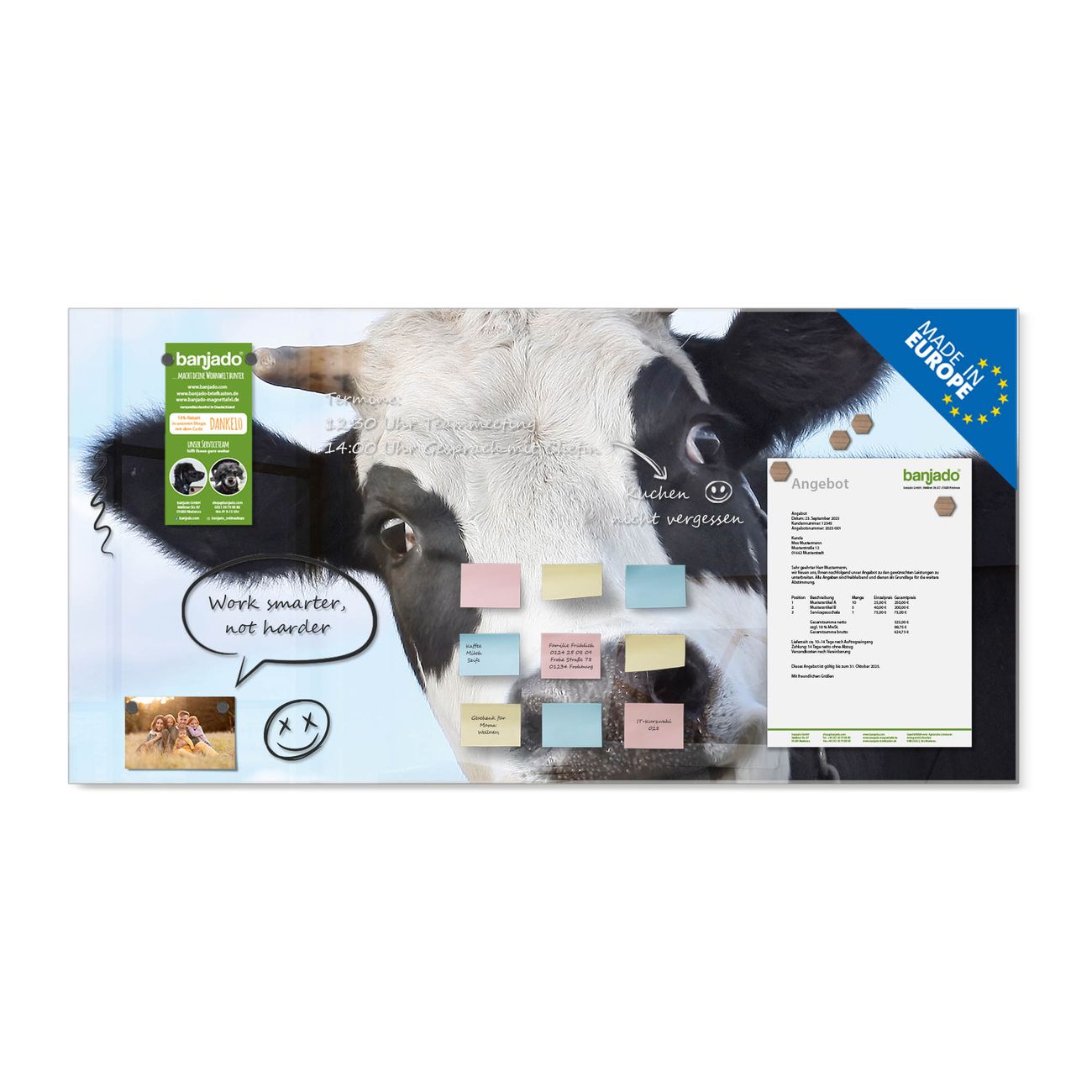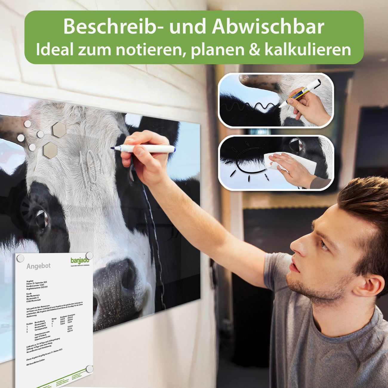 Jede Glas Magnettafel wird in unserer Werkstatt von Hand gefertigt und sorgfältig geprüft. So erhalten Sie ein echtes Qualitätsprodukt, das Funktion und Ästhetik perfekt vereint.?? Warum banjado?