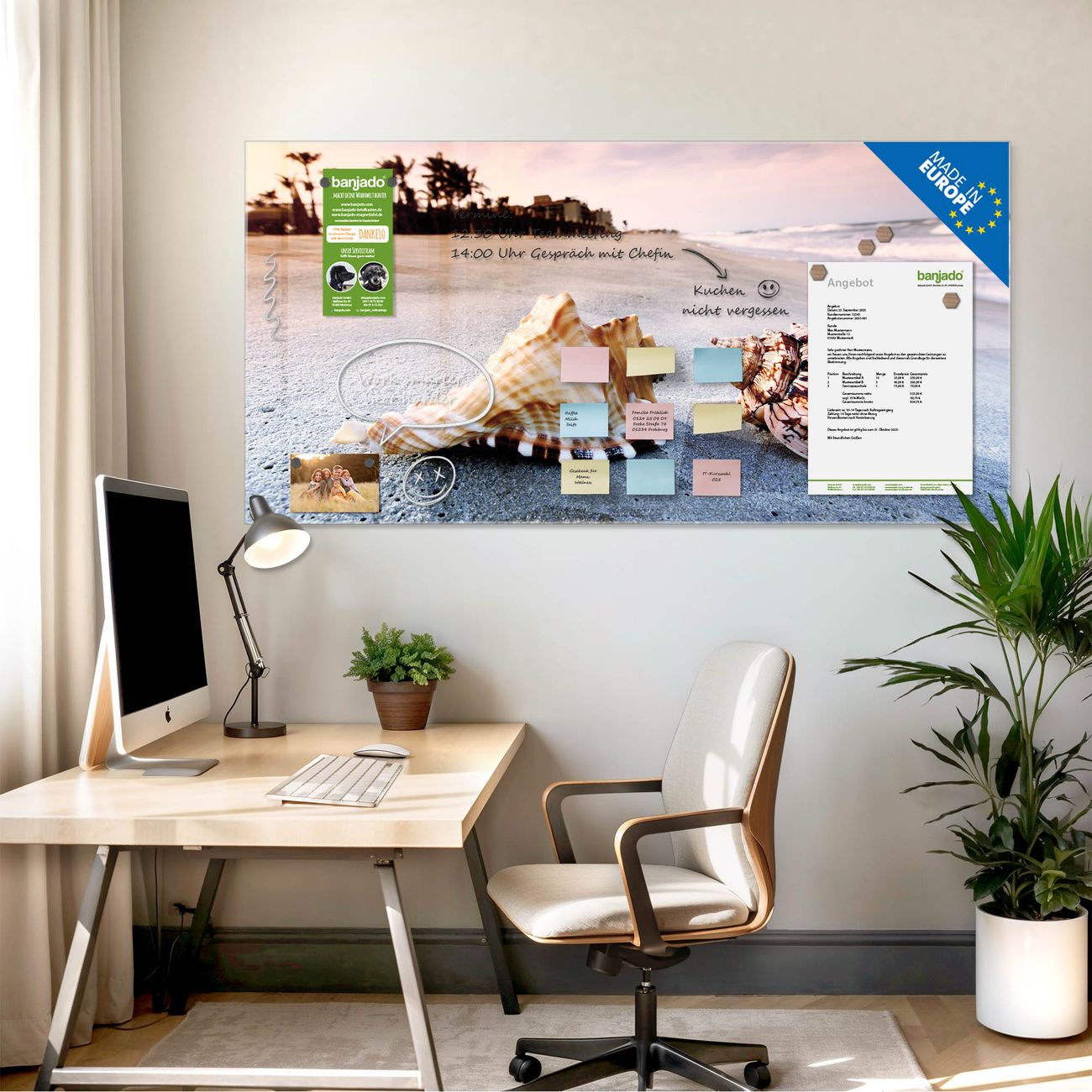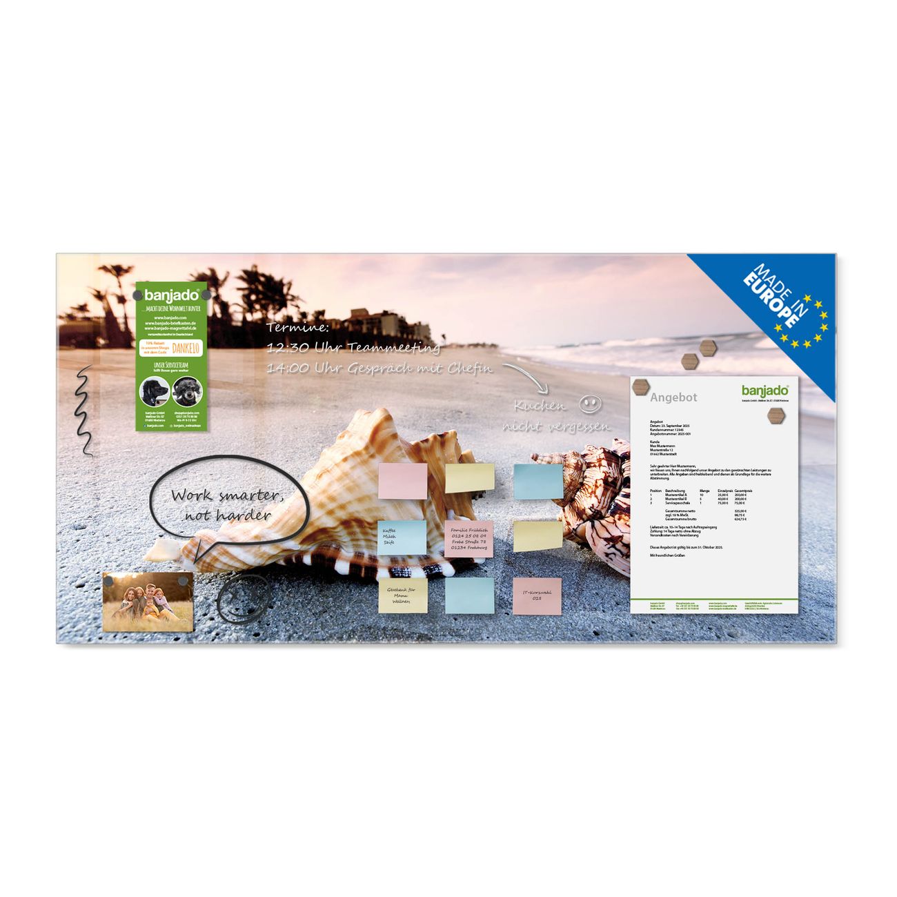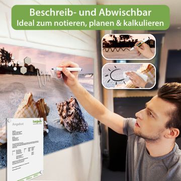 Die banjado Glas Magnettafel mit dem Motiv Motiv Muscheln verbindet Funktionalität mit Stil. Sie ersetzt das Zettelchaos durch klare Strukturen und bringt dabei eine warme, natürliche Atmosphäre in Ihr Zuhause. Ob im Büro, in der Küche oder im Eingangsbereich - dieses Design-Board zieht Blicke an und sorgt für Ordnung mit Charakter.