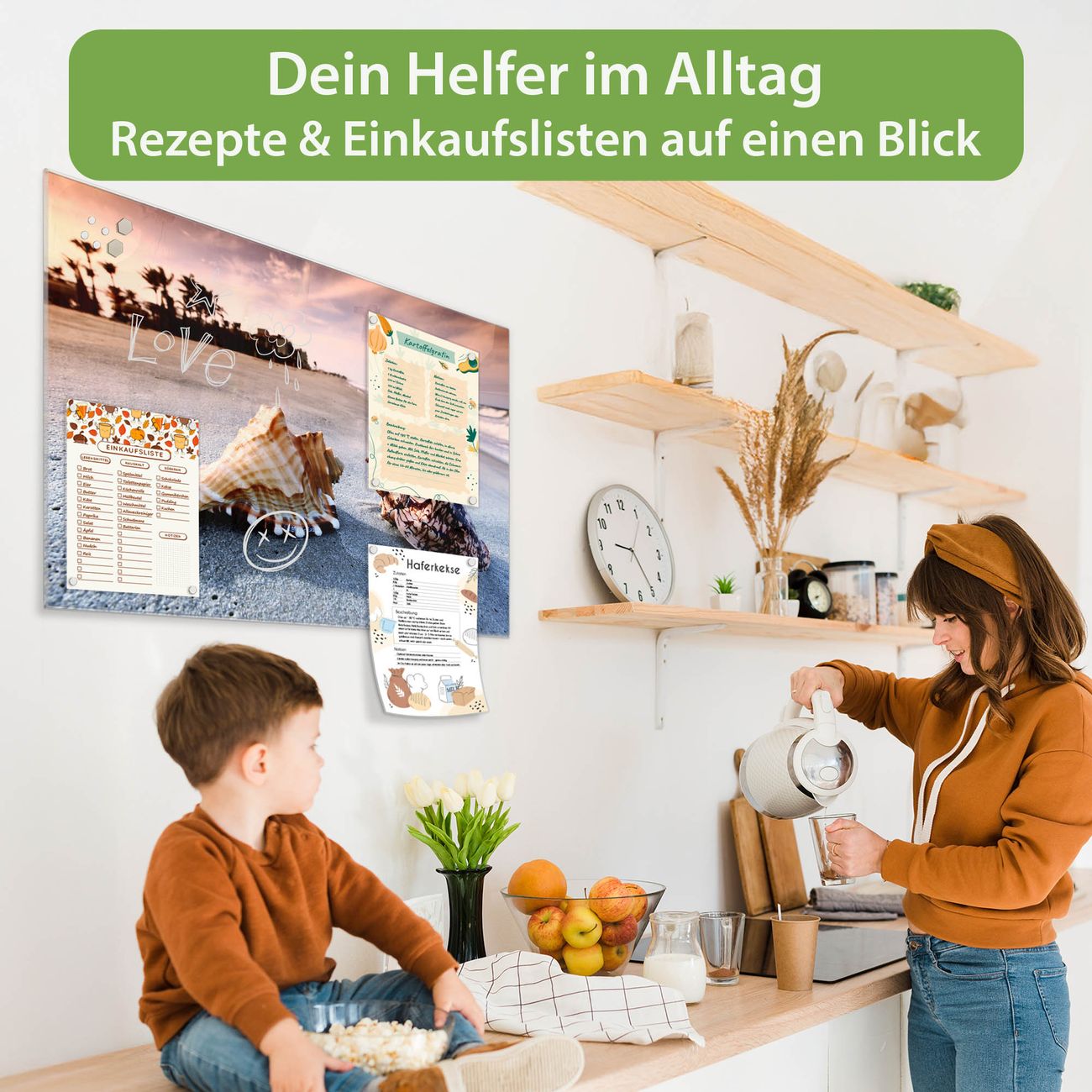 Ein Stück Design, das Ihren Alltag organisiert. Schreiben, heften, inspirieren - alles an einem Ort. Qualität, die man spürt. Montage leicht gemacht. Handwerk mit Herz - veredelt in Sachsen. Einzigartiges Design mit Motiv Motiv Muscheln Beschreibbare Glasoberfläche, leicht zu reinigen Starke Magnetkraft durch Stahlrückwand Inklusive 4 Neodym-Magneten Flexible Montageoptionen Handveredelt in Sachsen - Qualität, die bleibt