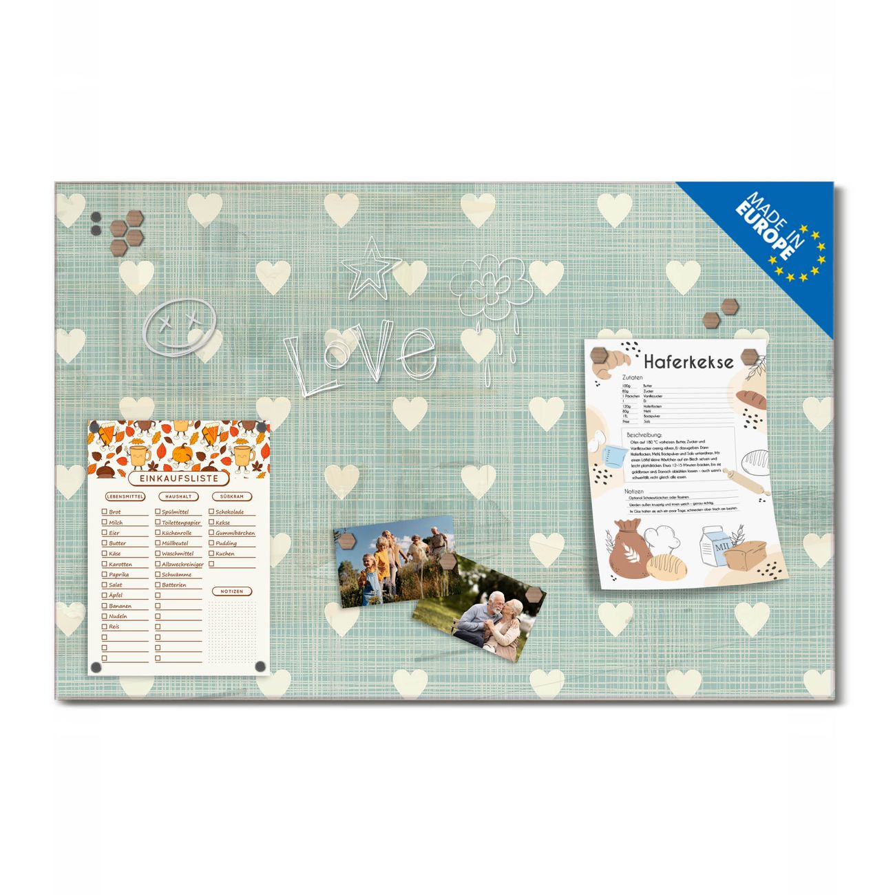 Ein Stück Design, das Ihren Alltag organisiert. Schreiben, heften, inspirieren - alles an einem Ort. Qualität, die man spürt. Montage leicht gemacht. Handwerk mit Herz - veredelt in Sachsen. Einzigartiges Design mit Motiv Motiv Muster Herzen Beschreibbare Glasoberfläche, leicht zu reinigen Starke Magnetkraft durch Stahlrückwand Inklusive 4 Neodym-Magneten Flexible Montageoptionen Handveredelt in Sachsen - Qualität, die bleibt