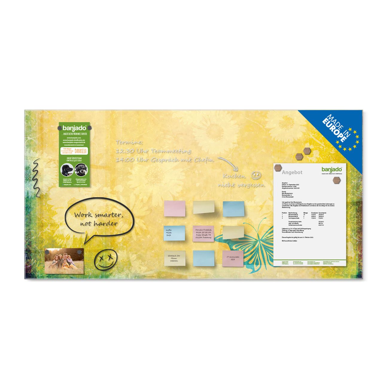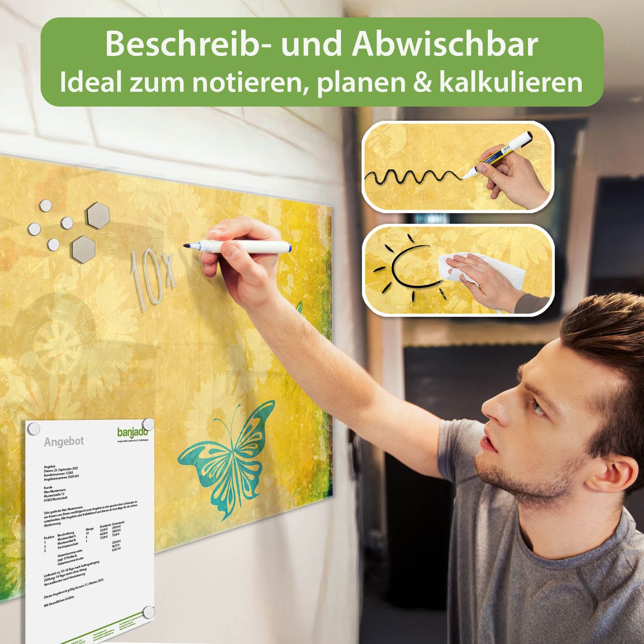 Jede Glas Magnettafel wird in unserer Werkstatt von Hand gefertigt und sorgfältig geprüft. So erhalten Sie ein echtes Qualitätsprodukt, das Funktion und Ästhetik perfekt vereint.?? Warum banjado?