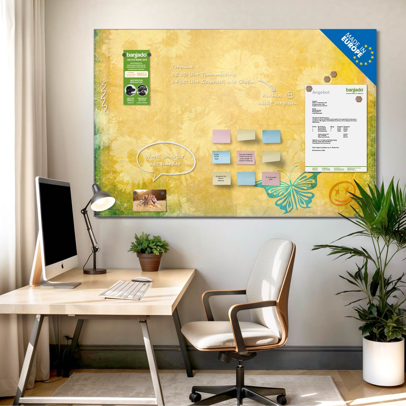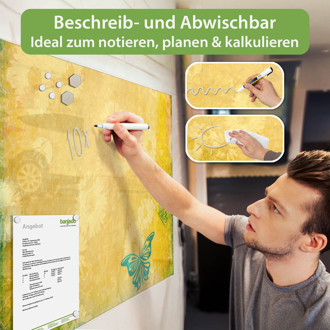Die banjado Glas Magnettafel mit dem Motiv Motiv Muster Sommer verbindet Funktionalität mit Stil. Sie ersetzt das Zettelchaos durch klare Strukturen und bringt dabei eine warme, natürliche Atmosphäre in Ihr Zuhause. Ob im Büro, in der Küche oder im Eingangsbereich - dieses Design-Board zieht Blicke an und sorgt für Ordnung mit Charakter.