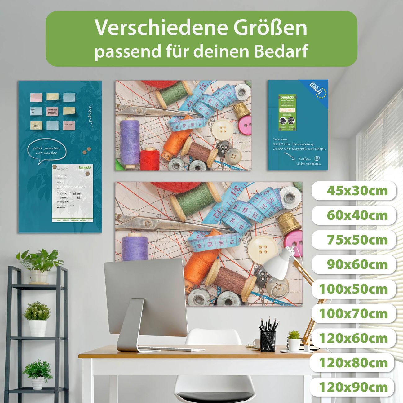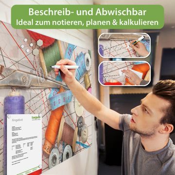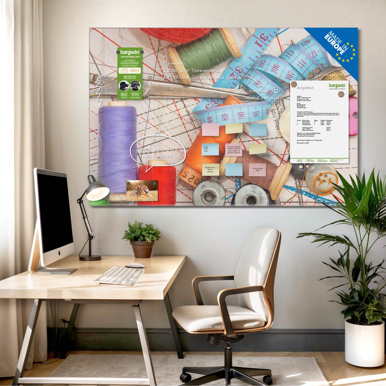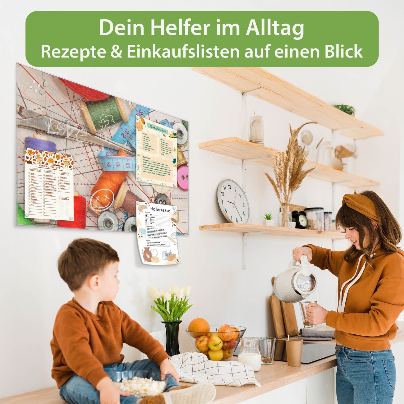 Die banjado Glas Magnettafel mit dem Motiv Motiv Nähen verbindet Funktionalität mit Stil. Sie ersetzt das Zettelchaos durch klare Strukturen und bringt dabei eine warme, natürliche Atmosphäre in Ihr Zuhause. Ob im Büro, in der Küche oder im Eingangsbereich - dieses Design-Board zieht Blicke an und sorgt für Ordnung mit Charakter.