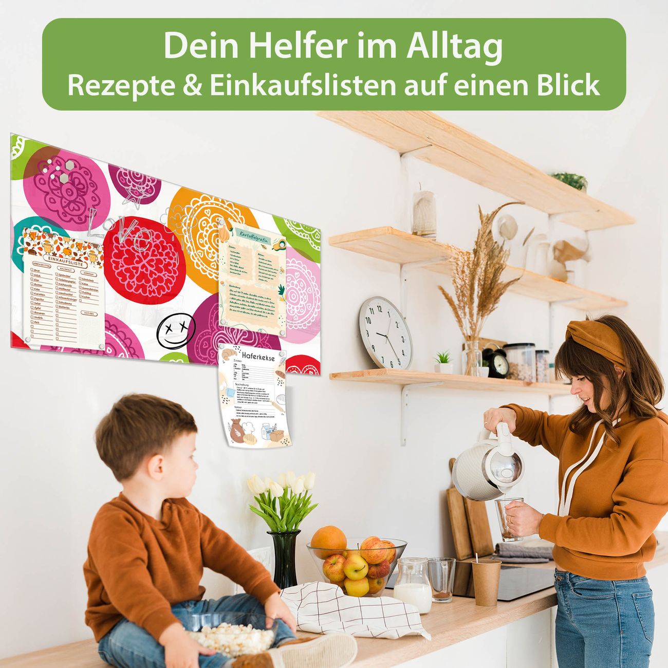 Auf der glatten Glasoberfläche lassen sich Termine, Rezepte oder Notizen ganz einfach mit Kreidestiften festhalten und rückstandslos entfernen. Starke Neodym-Magnete halten Ihre wichtigsten Erinnerungen sicher an Ort und Stelle. So entsteht Ihre ganz persönliche Ideenwand - jeden Tag neu.