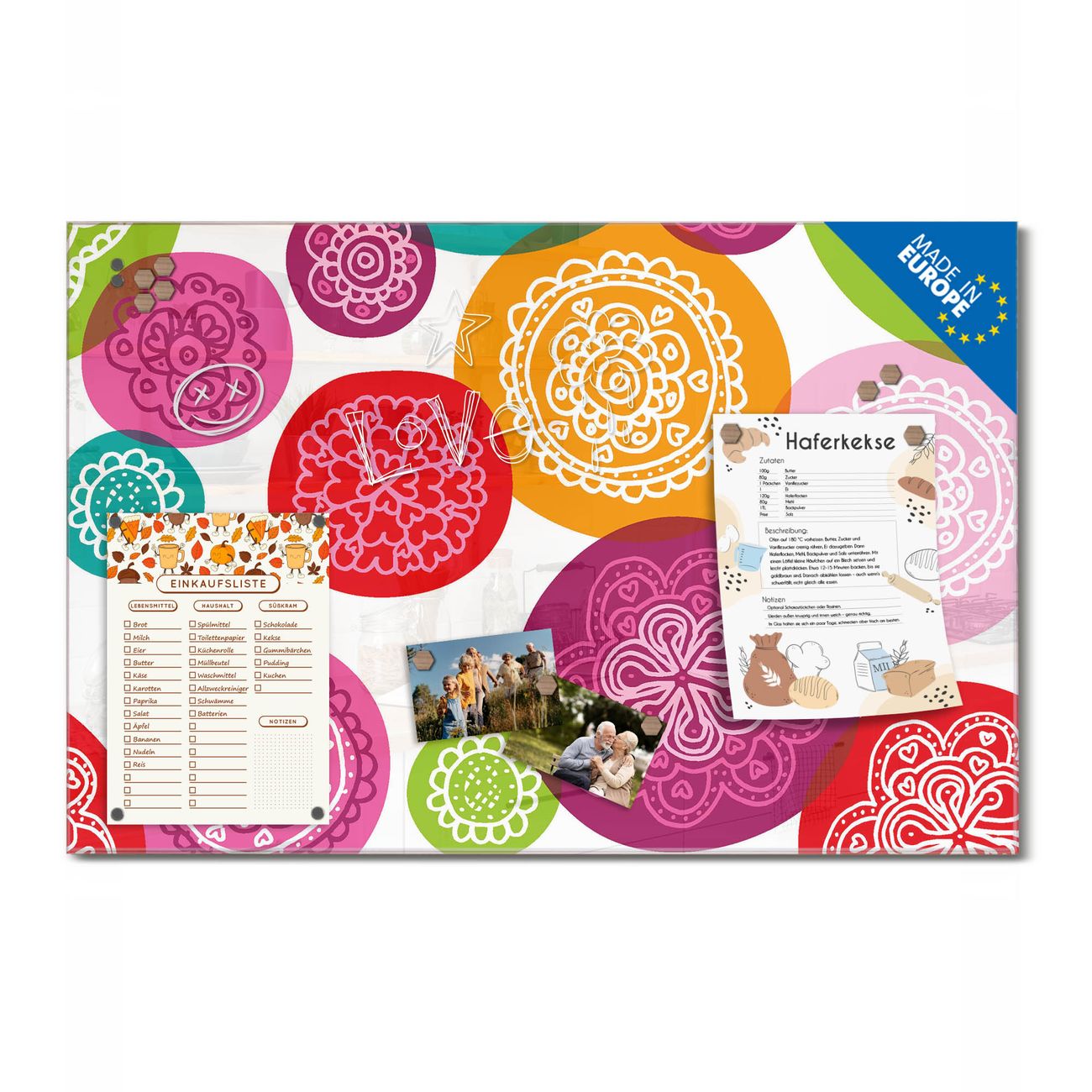Ein Stück Design, das Ihren Alltag organisiert. Schreiben, heften, inspirieren - alles an einem Ort. Qualität, die man spürt. Montage leicht gemacht. Handwerk mit Herz - veredelt in Sachsen. Einzigartiges Design mit Motiv Motiv Naive Blüten Beschreibbare Glasoberfläche, leicht zu reinigen Starke Magnetkraft durch Stahlrückwand Inklusive 4 Neodym-Magneten Flexible Montageoptionen Handveredelt in Sachsen - Qualität, die bleibt