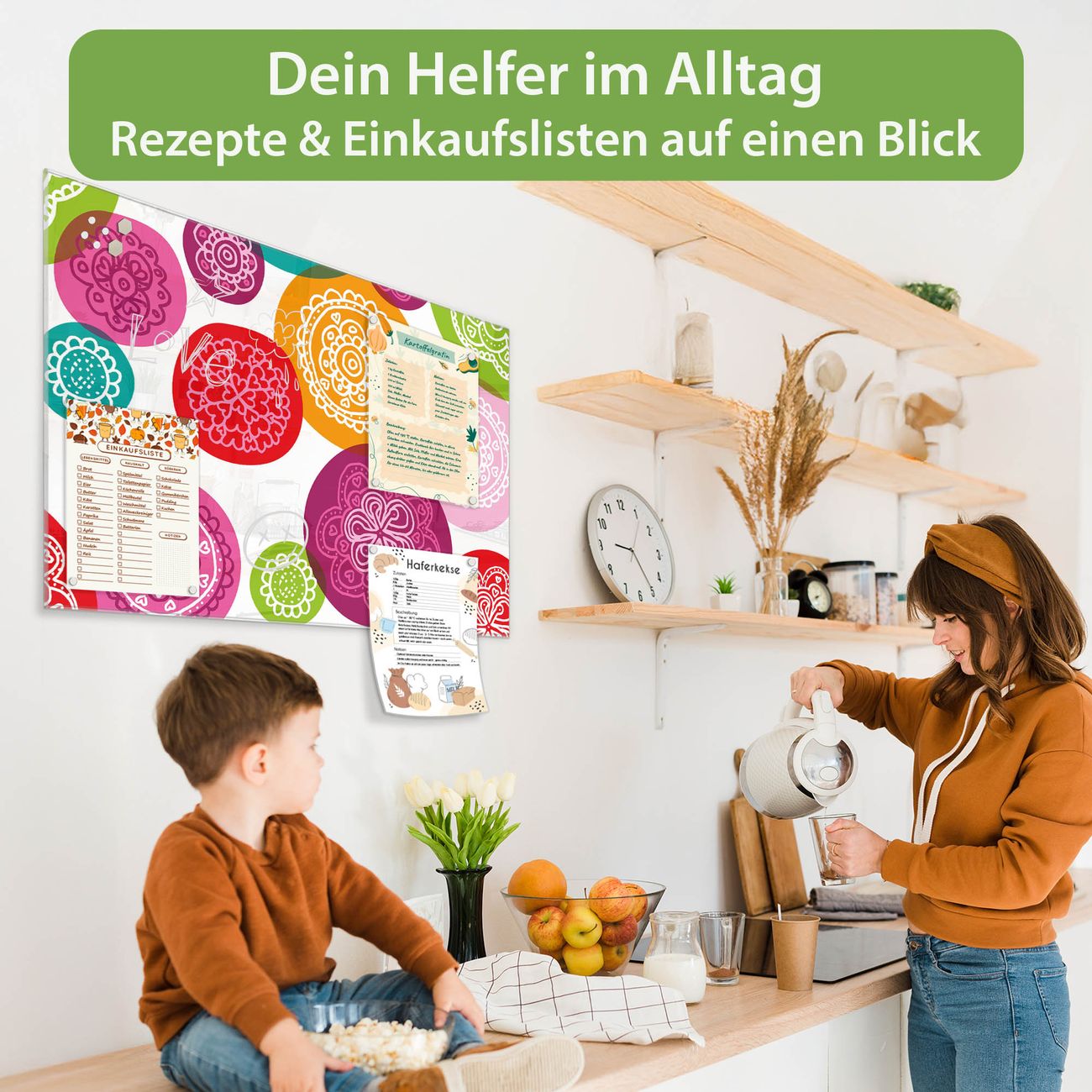 Auf der glatten Glasoberfläche lassen sich Termine, Rezepte oder Notizen ganz einfach mit Kreidestiften festhalten und rückstandslos entfernen. Starke Neodym-Magnete halten Ihre wichtigsten Erinnerungen sicher an Ort und Stelle. So entsteht Ihre ganz persönliche Ideenwand - jeden Tag neu.