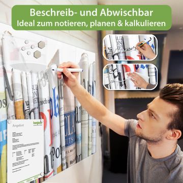 Die banjado Glas Magnettafel mit dem Motiv Motiv Presse verbindet Funktionalität mit Stil. Sie ersetzt das Zettelchaos durch klare Strukturen und bringt dabei eine warme, natürliche Atmosphäre in Ihr Zuhause. Ob im Büro, in der Küche oder im Eingangsbereich - dieses Design-Board zieht Blicke an und sorgt für Ordnung mit Charakter.