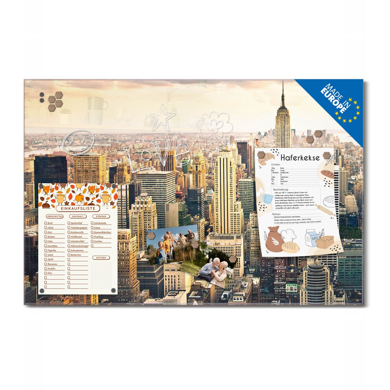 Ein Stück Design, das Ihren Alltag organisiert. Schreiben, heften, inspirieren - alles an einem Ort. Qualität, die man spürt. Montage leicht gemacht. Handwerk mit Herz - veredelt in Sachsen. Einzigartiges Design mit Motiv Motiv New York City Beschreibbare Glasoberfläche, leicht zu reinigen Starke Magnetkraft durch Stahlrückwand Inklusive 4 Neodym-Magneten Flexible Montageoptionen Handveredelt in Sachsen - Qualität, die bleibt