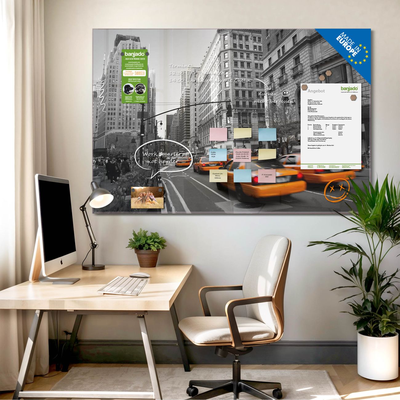 Die banjado Glas Magnettafel mit dem Motiv Motiv New York Taxi verbindet Funktionalität mit Stil. Sie ersetzt das Zettelchaos durch klare Strukturen und bringt dabei eine warme, natürliche Atmosphäre in Ihr Zuhause. Ob im Büro, in der Küche oder im Eingangsbereich - dieses Design-Board zieht Blicke an und sorgt für Ordnung mit Charakter.