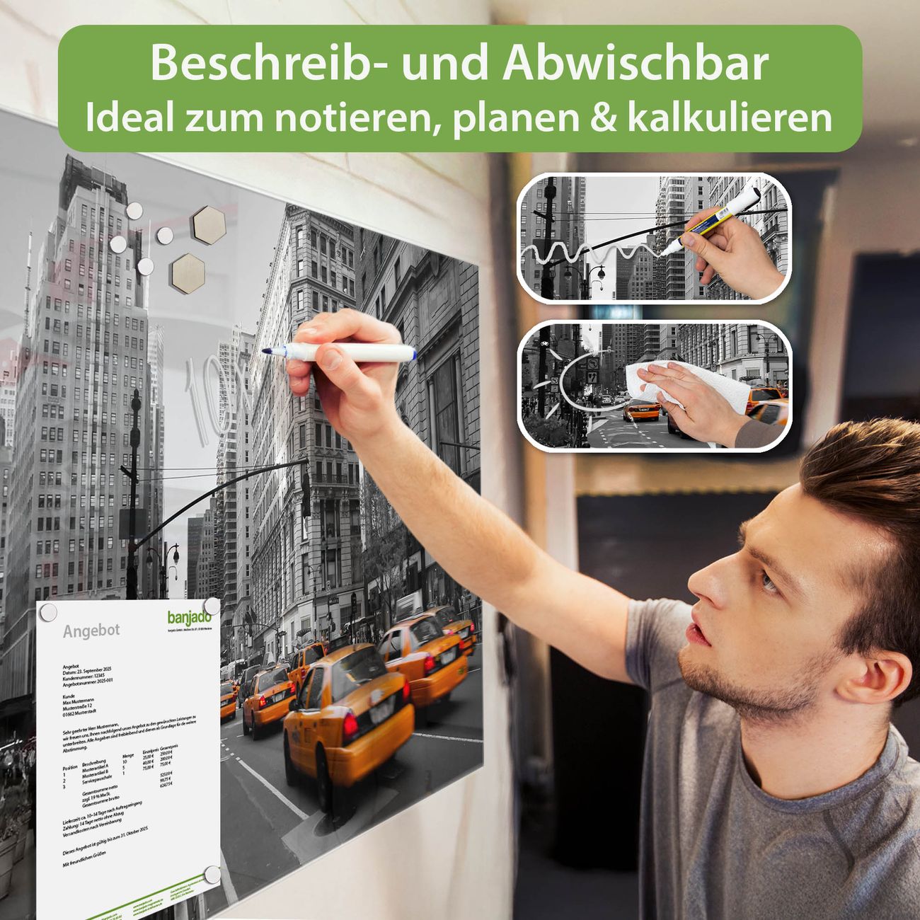 Bitte beachten Sie, dass ausschliessliche spezielle Magnete an der Glastafel haften. Wir empfehlen banjado Neodym Magnete, diese sind durch uns auf Wirksamkeit geprüft.