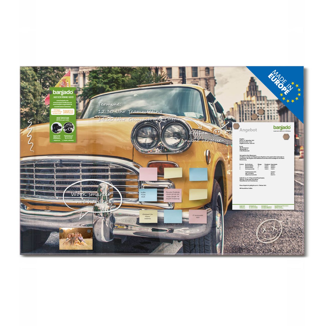 Ein Stück Design, das Ihren Alltag organisiert. Schreiben, heften, inspirieren - alles an einem Ort. Qualität, die man spürt. Montage leicht gemacht. Handwerk mit Herz - veredelt in Sachsen. Einzigartiges Design mit Motiv Motiv Yellow Cab Beschreibbare Glasoberfläche, leicht zu reinigen Starke Magnetkraft durch Stahlrückwand Inklusive 4 Neodym-Magneten Flexible Montageoptionen Handveredelt in Sachsen - Qualität, die bleibt