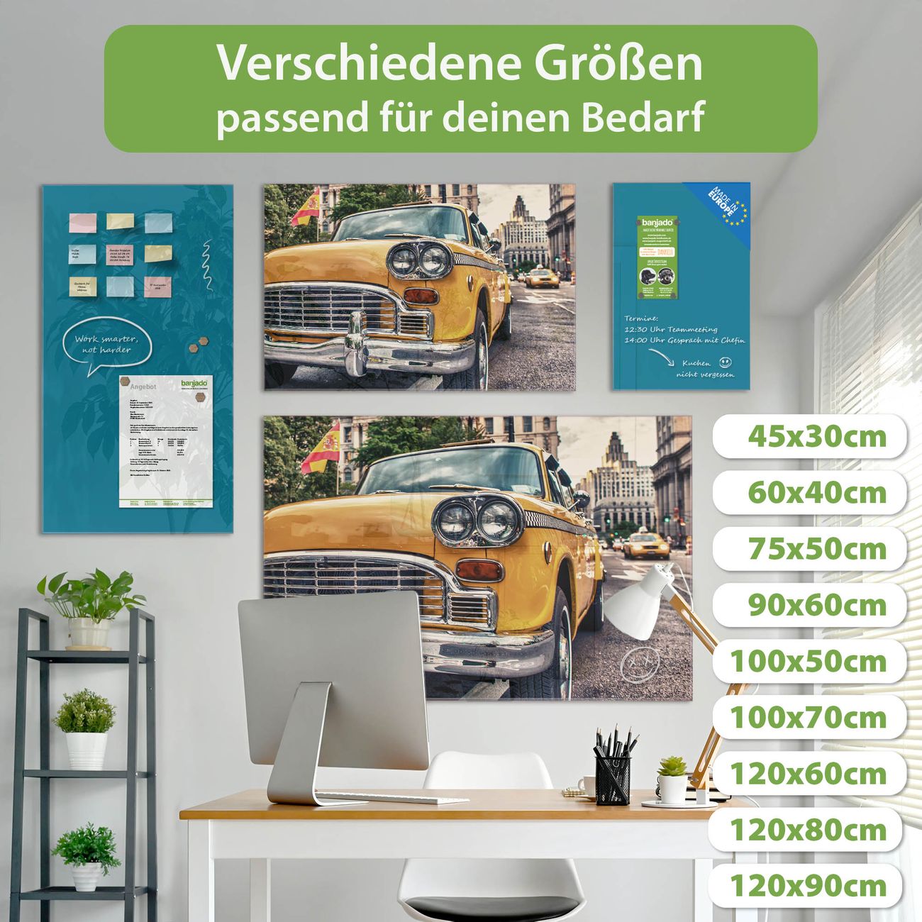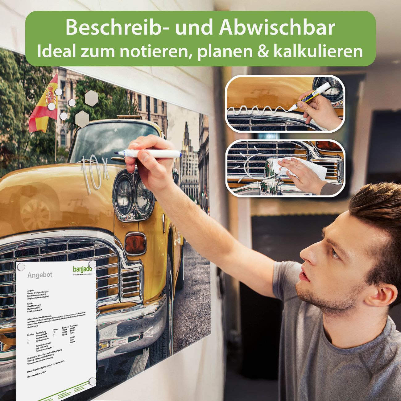 Jede Glas Magnettafel wird in unserer Werkstatt von Hand gefertigt und sorgfältig geprüft. So erhalten Sie ein echtes Qualitätsprodukt, das Funktion und Ästhetik perfekt vereint.?? Warum banjado?