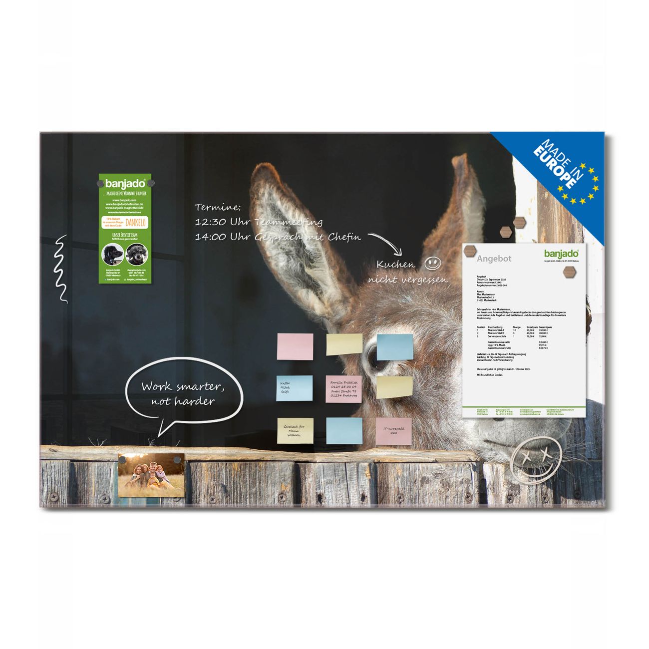Jede Glas Magnettafel wird in unserer Werkstatt von Hand gefertigt und sorgfältig geprüft. So erhalten Sie ein echtes Qualitätsprodukt, das Funktion und Ästhetik perfekt vereint.?? Warum banjado?