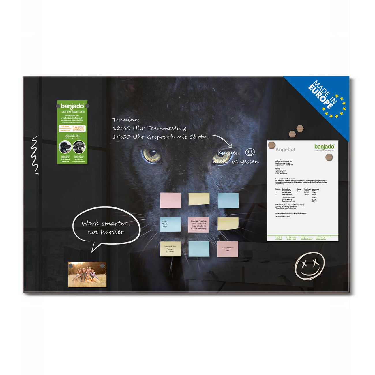 Jede Glas Magnettafel wird in unserer Werkstatt von Hand gefertigt und sorgfältig geprüft. So erhalten Sie ein echtes Qualitätsprodukt, das Funktion und Ästhetik perfekt vereint.?? Warum banjado?