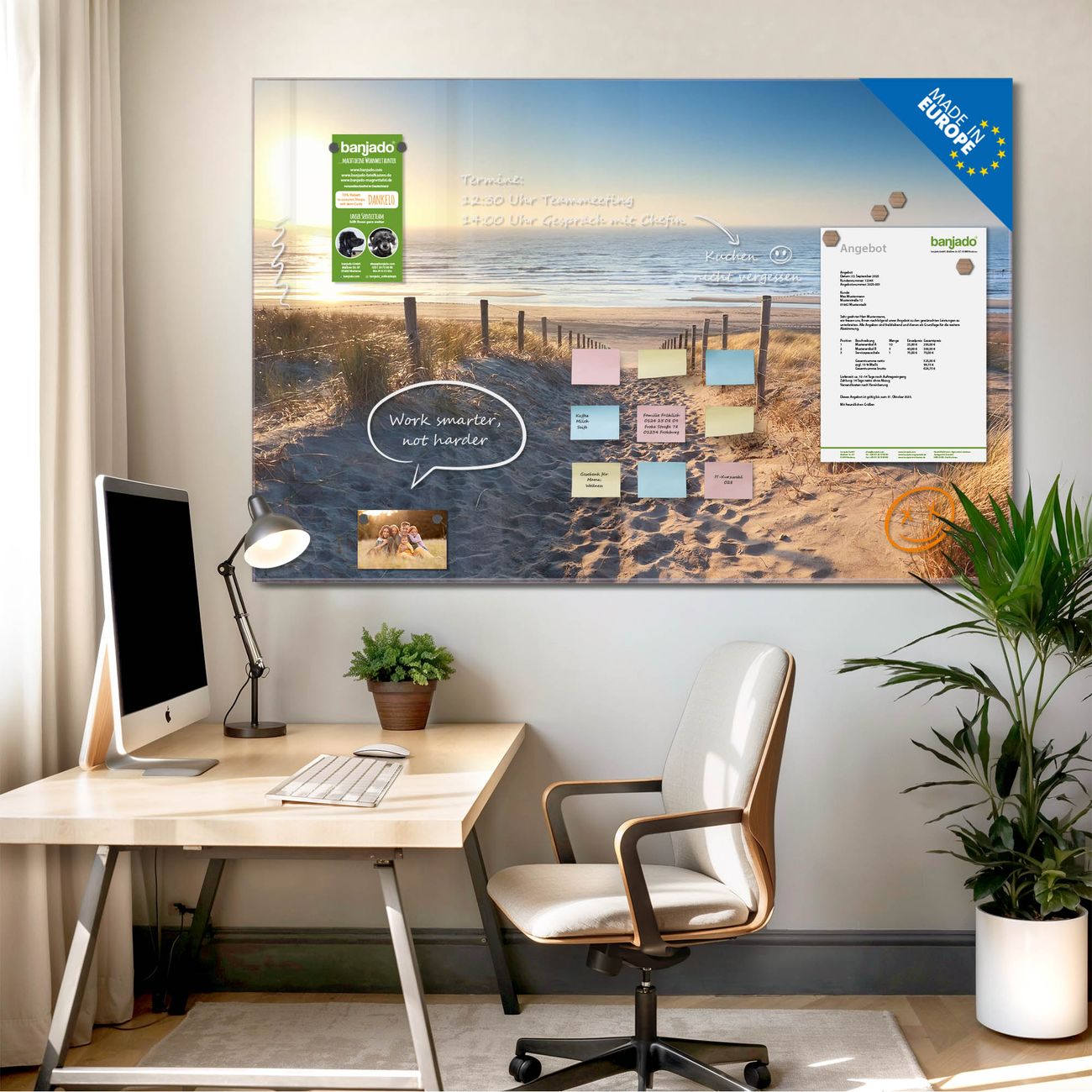Jede Glas Magnettafel wird in unserer Werkstatt von Hand gefertigt und sorgfältig geprüft. So erhalten Sie ein echtes Qualitätsprodukt, das Funktion und Ästhetik perfekt vereint.?? Warum banjado?
