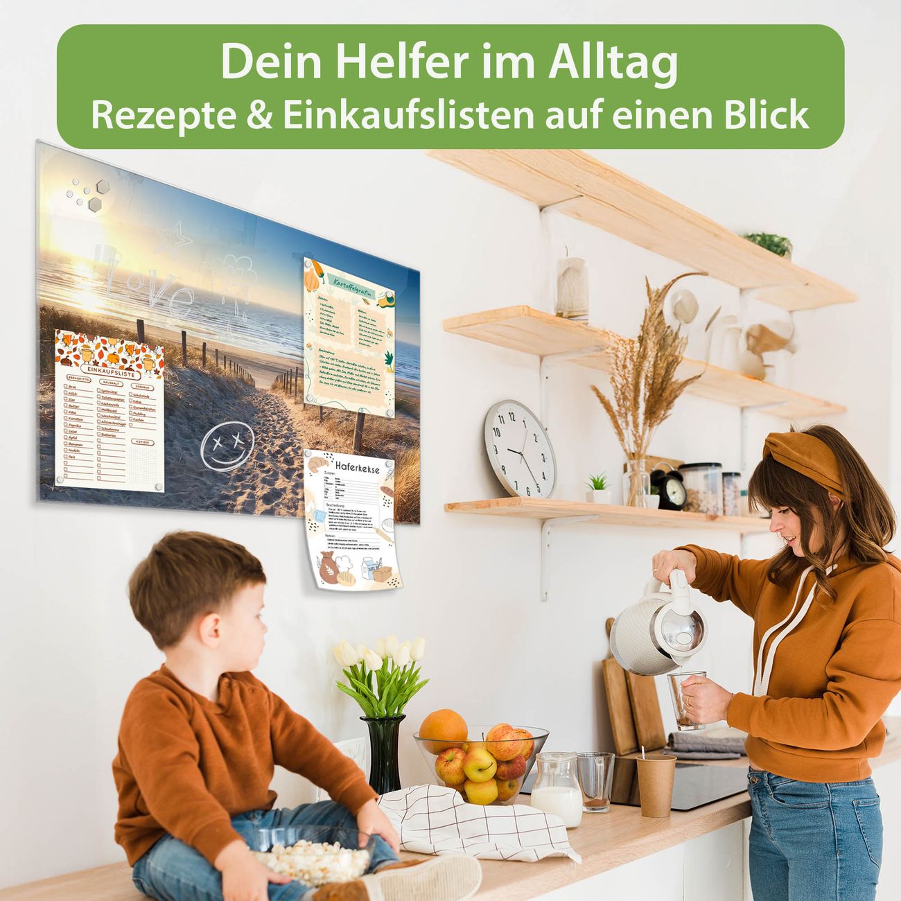 Auf der glatten Glasoberfläche lassen sich Termine, Rezepte oder Notizen ganz einfach mit Kreidestiften festhalten und rückstandslos entfernen. Starke Neodym-Magnete halten Ihre wichtigsten Erinnerungen sicher an Ort und Stelle. So entsteht Ihre ganz persönliche Ideenwand - jeden Tag neu.