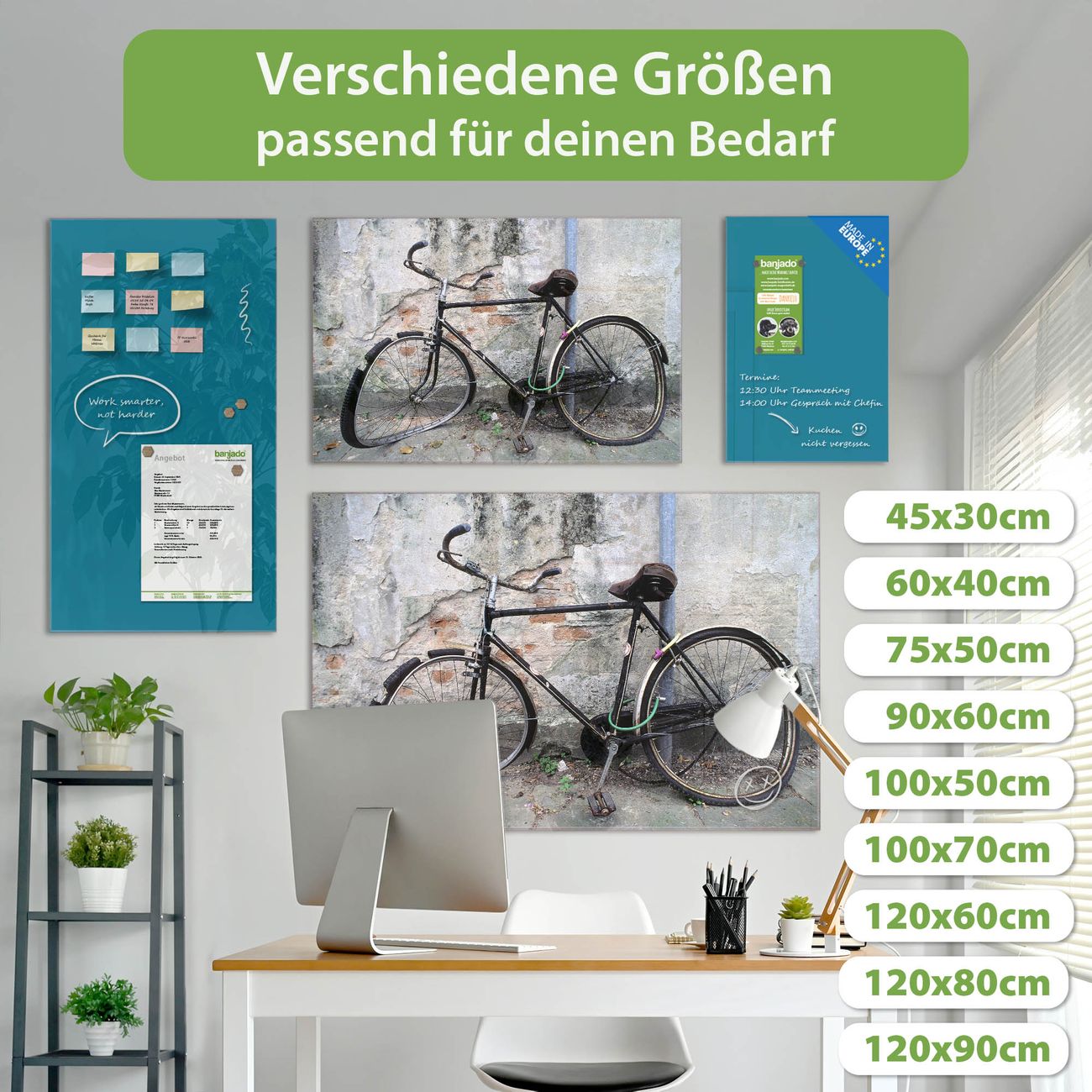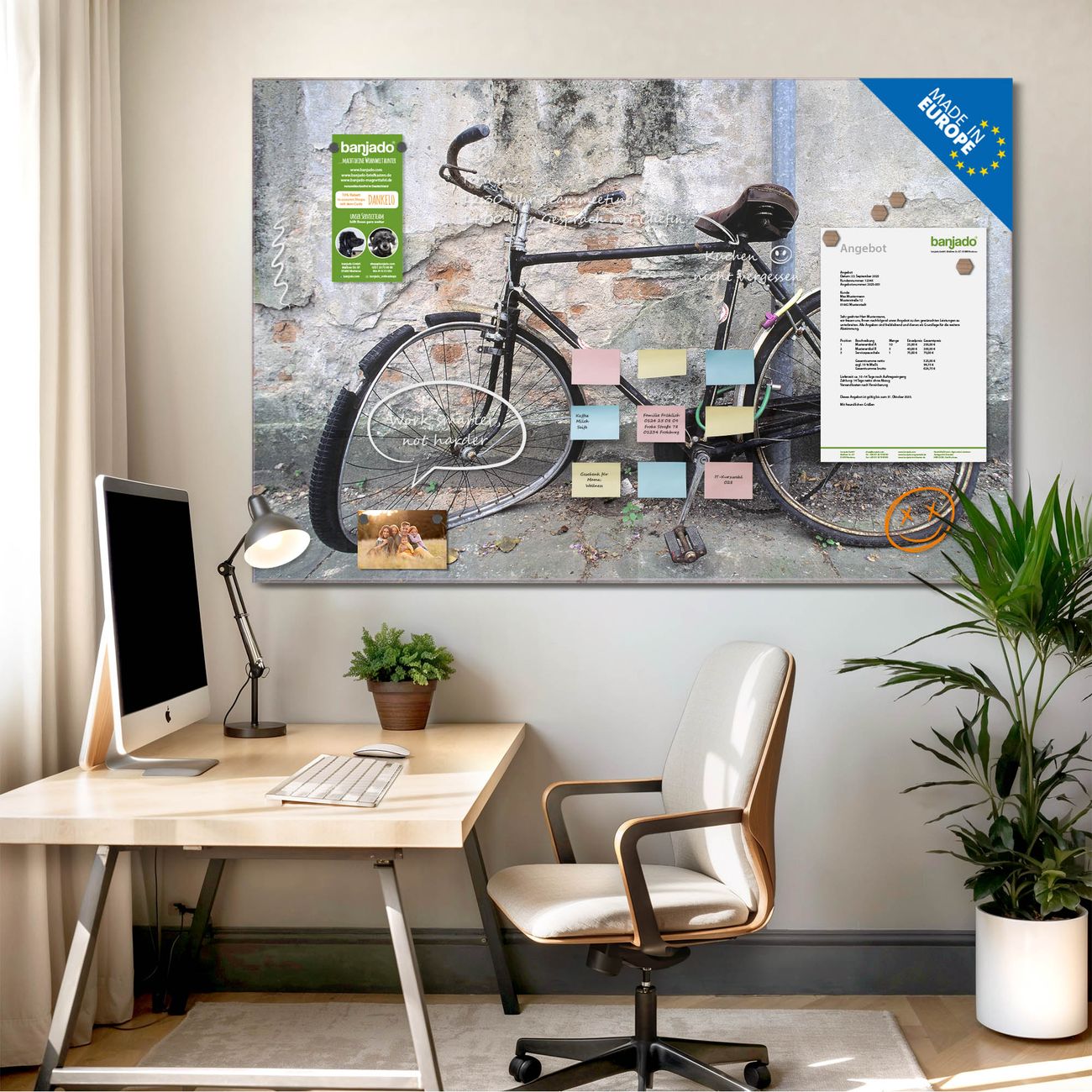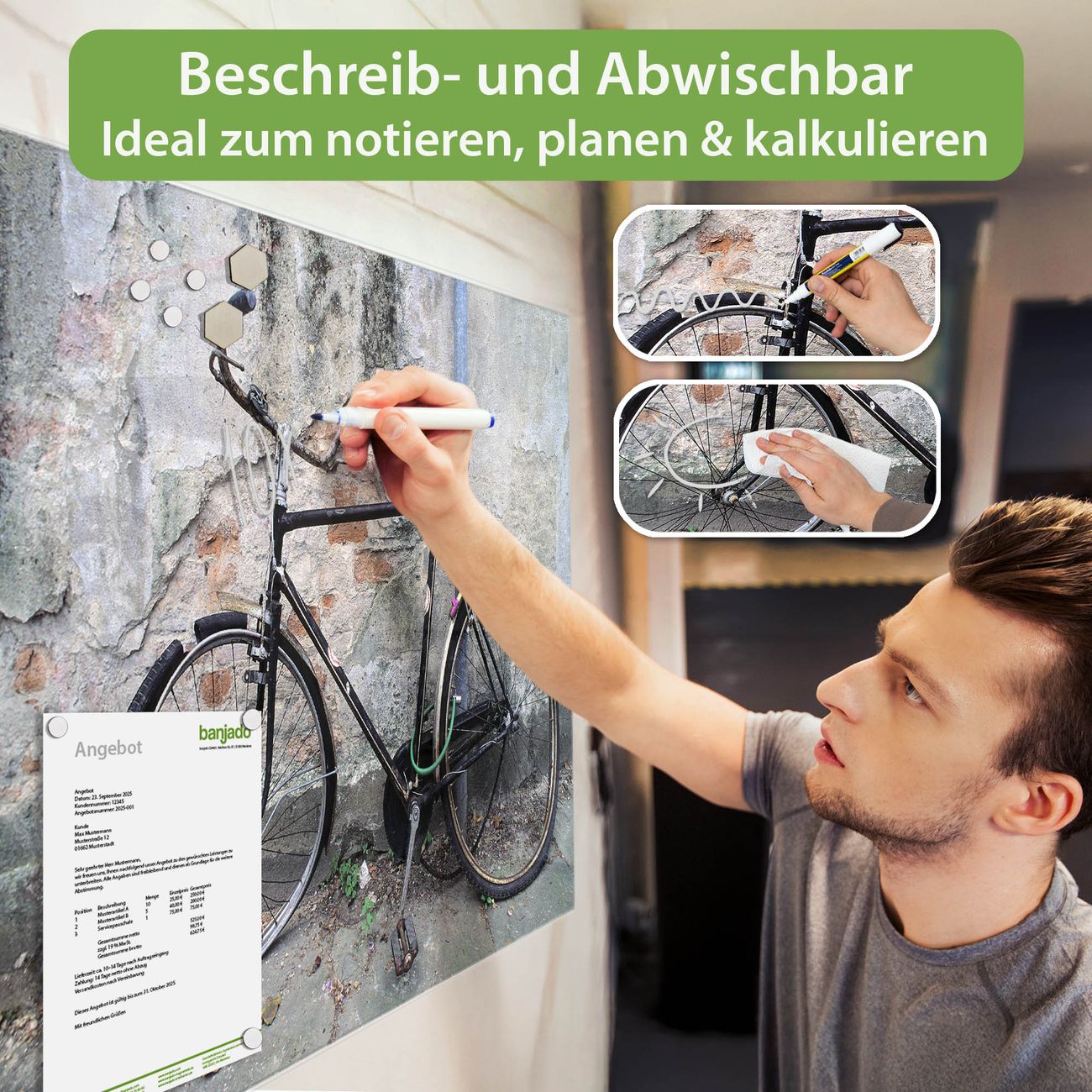 Jede Glas Magnettafel wird in unserer Werkstatt von Hand gefertigt und sorgfältig geprüft. So erhalten Sie ein echtes Qualitätsprodukt, das Funktion und Ästhetik perfekt vereint.?? Warum banjado?