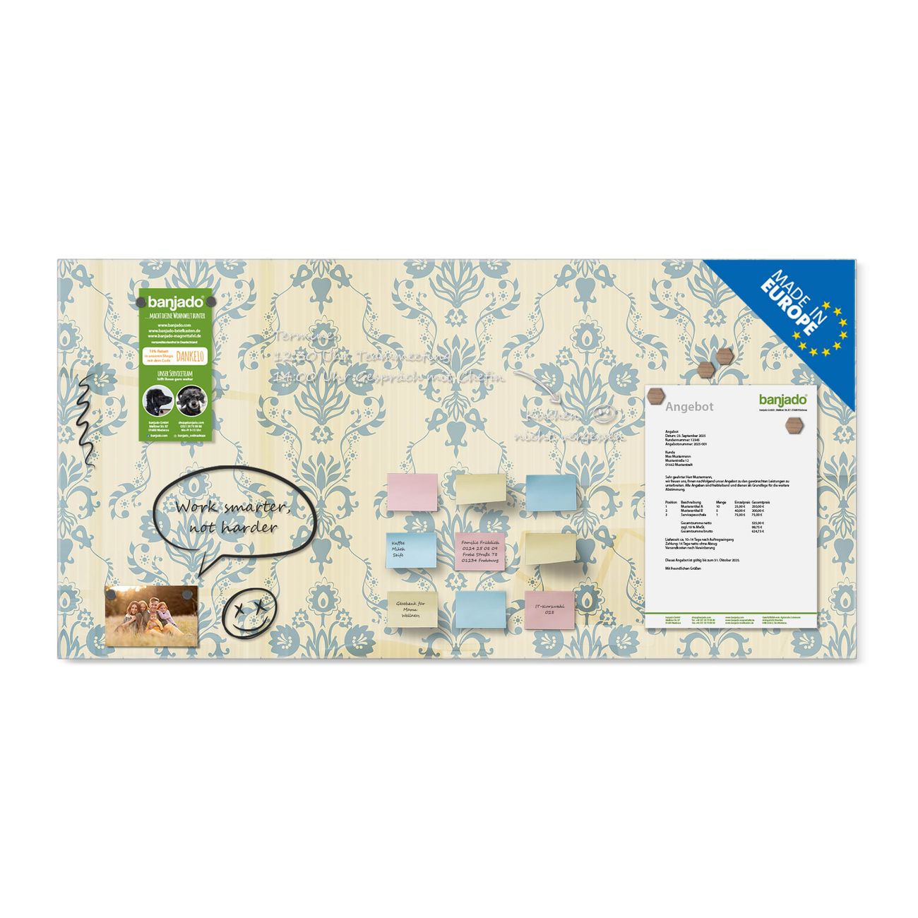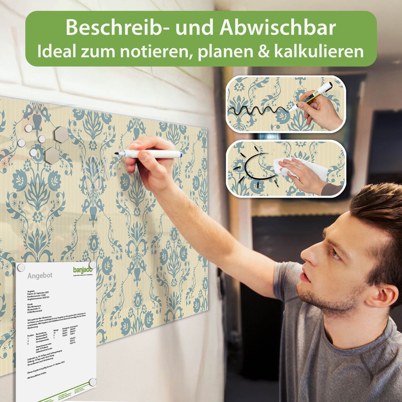 Jede Glas Magnettafel wird in unserer Werkstatt von Hand gefertigt und sorgfältig geprüft. So erhalten Sie ein echtes Qualitätsprodukt, das Funktion und Ästhetik perfekt vereint.?? Warum banjado?