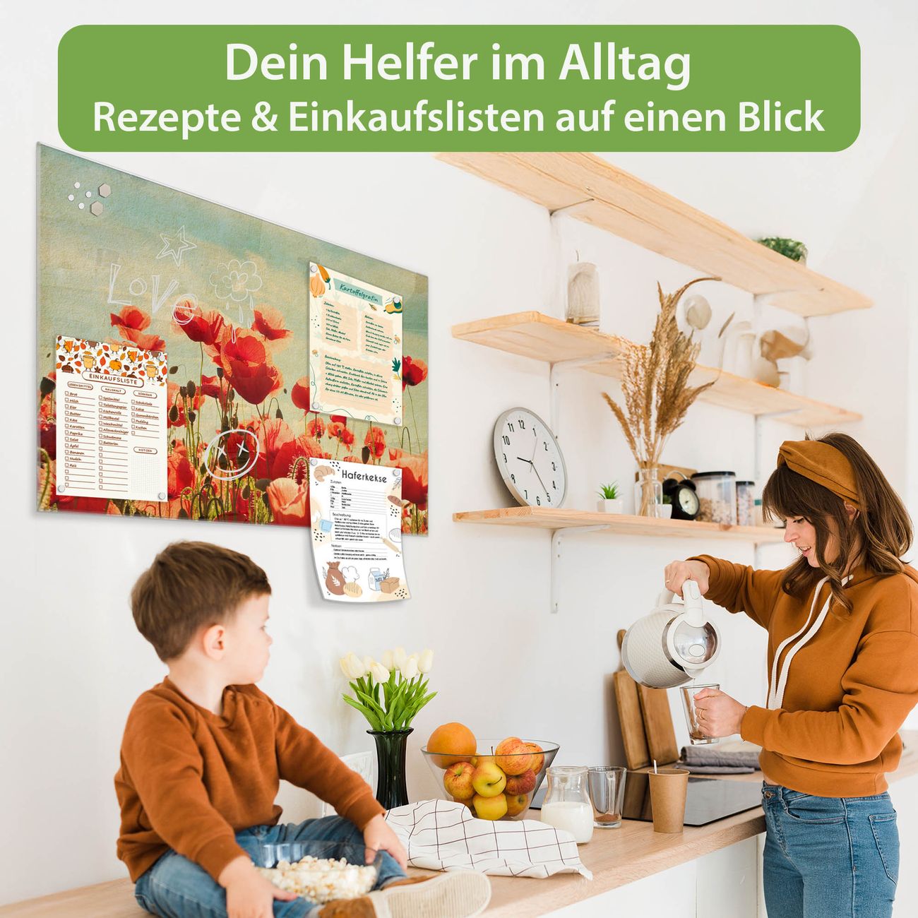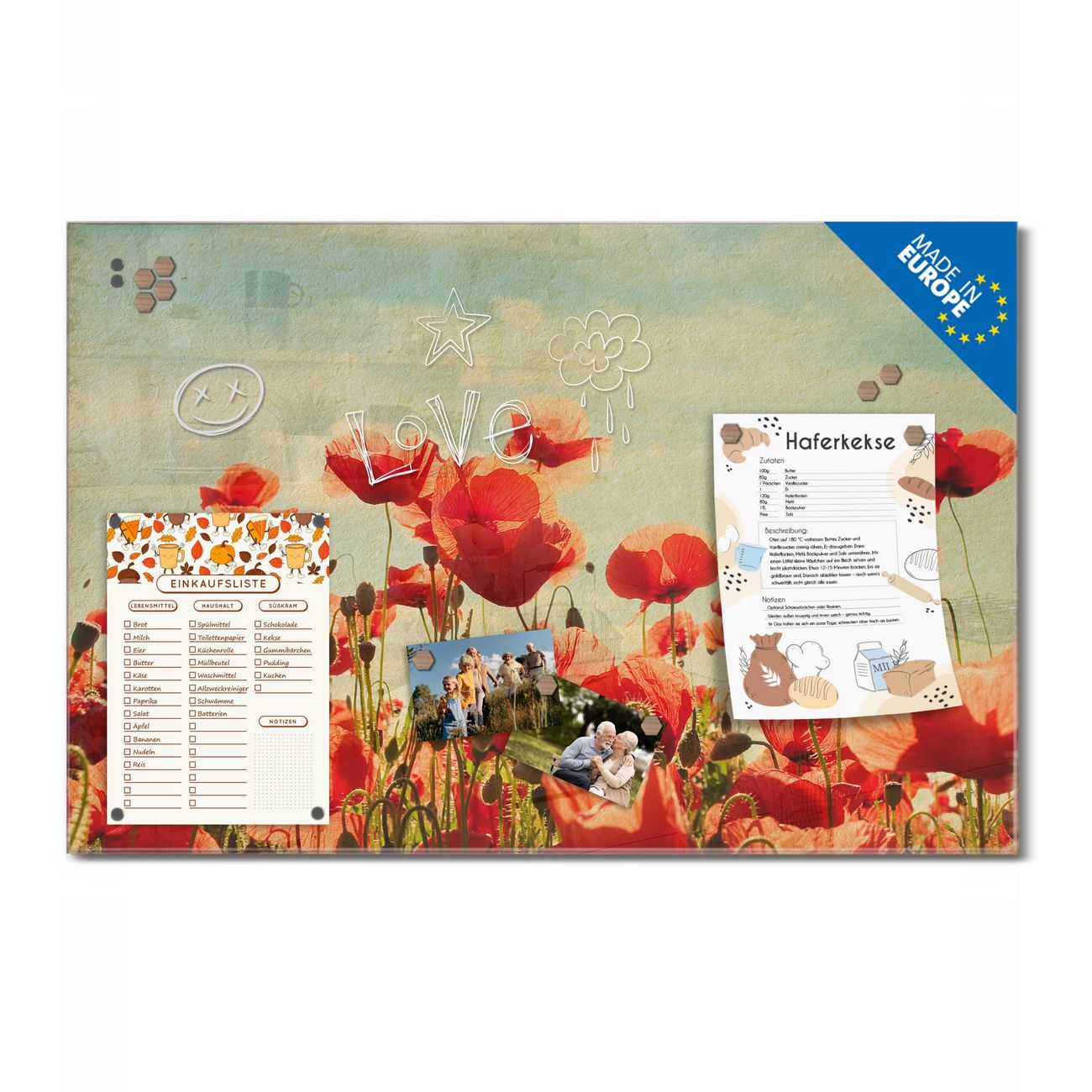 Ein Stück Design, das Ihren Alltag organisiert. Schreiben, heften, inspirieren - alles an einem Ort. Qualität, die man spürt. Montage leicht gemacht. Handwerk mit Herz - veredelt in Sachsen. Einzigartiges Design mit Motiv Motiv Oktobermohn Beschreibbare Glasoberfläche, leicht zu reinigen Starke Magnetkraft durch Stahlrückwand Inklusive 4 Neodym-Magneten Flexible Montageoptionen Handveredelt in Sachsen - Qualität, die bleibt