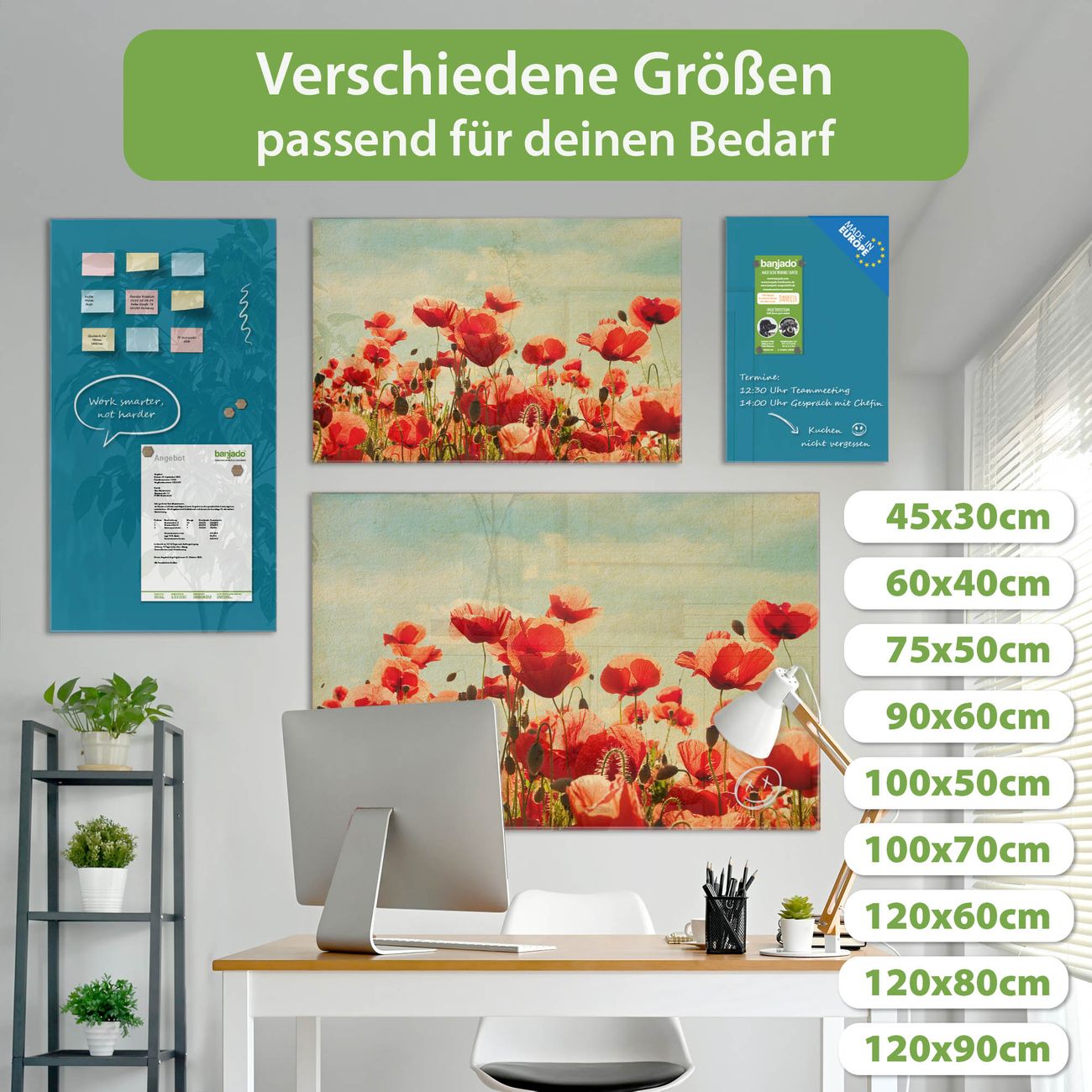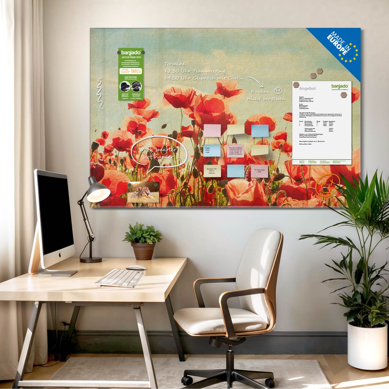 Jede Glas Magnettafel wird in unserer Werkstatt von Hand gefertigt und sorgfältig geprüft. So erhalten Sie ein echtes Qualitätsprodukt, das Funktion und Ästhetik perfekt vereint.?? Warum banjado?
