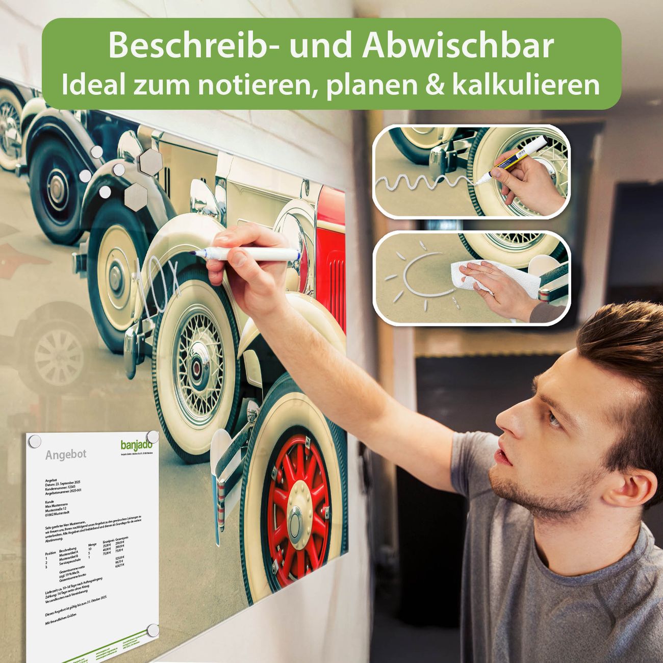 Jede Glas Magnettafel wird in unserer Werkstatt von Hand gefertigt und sorgfältig geprüft. So erhalten Sie ein echtes Qualitätsprodukt, das Funktion und Ästhetik perfekt vereint.?? Warum banjado?