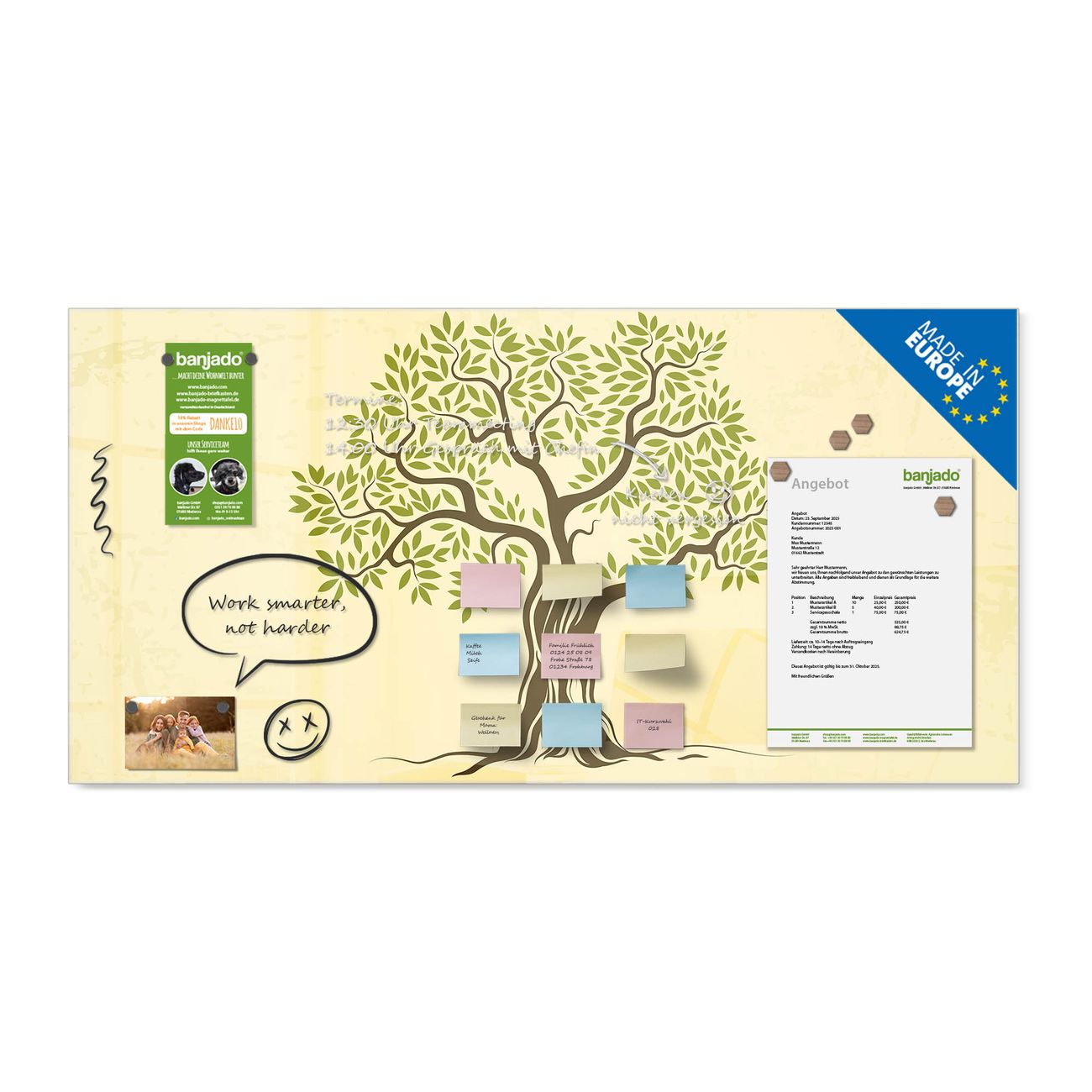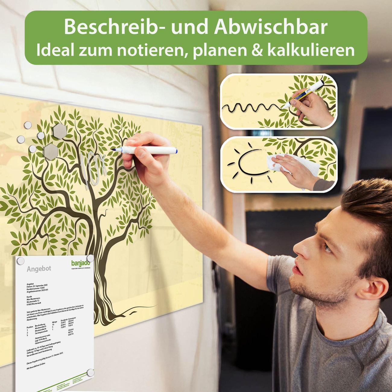Jede Glas Magnettafel wird in unserer Werkstatt von Hand gefertigt und sorgfältig geprüft. So erhalten Sie ein echtes Qualitätsprodukt, das Funktion und Ästhetik perfekt vereint.?? Warum banjado?