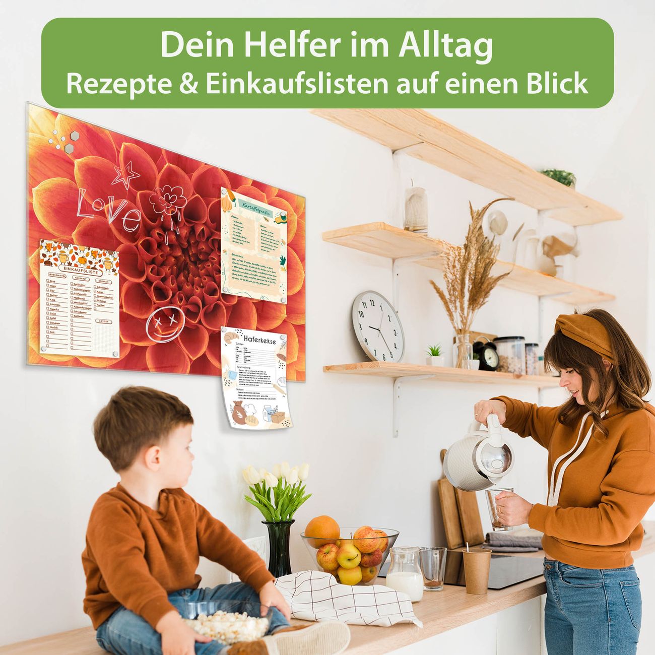 Auf der glatten Glasoberfläche lassen sich Termine, Rezepte oder Notizen ganz einfach mit Kreidestiften festhalten und rückstandslos entfernen. Starke Neodym-Magnete halten Ihre wichtigsten Erinnerungen sicher an Ort und Stelle. So entsteht Ihre ganz persönliche Ideenwand - jeden Tag neu.