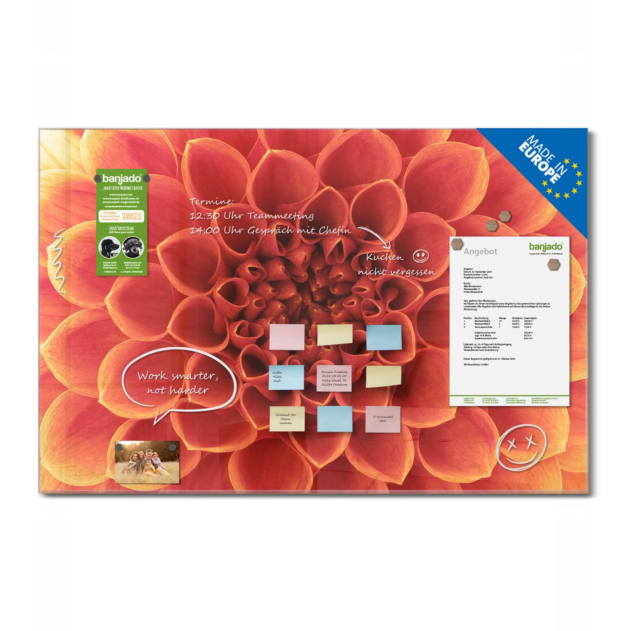Jede Glas Magnettafel wird in unserer Werkstatt von Hand gefertigt und sorgfältig geprüft. So erhalten Sie ein echtes Qualitätsprodukt, das Funktion und Ästhetik perfekt vereint.?? Warum banjado?