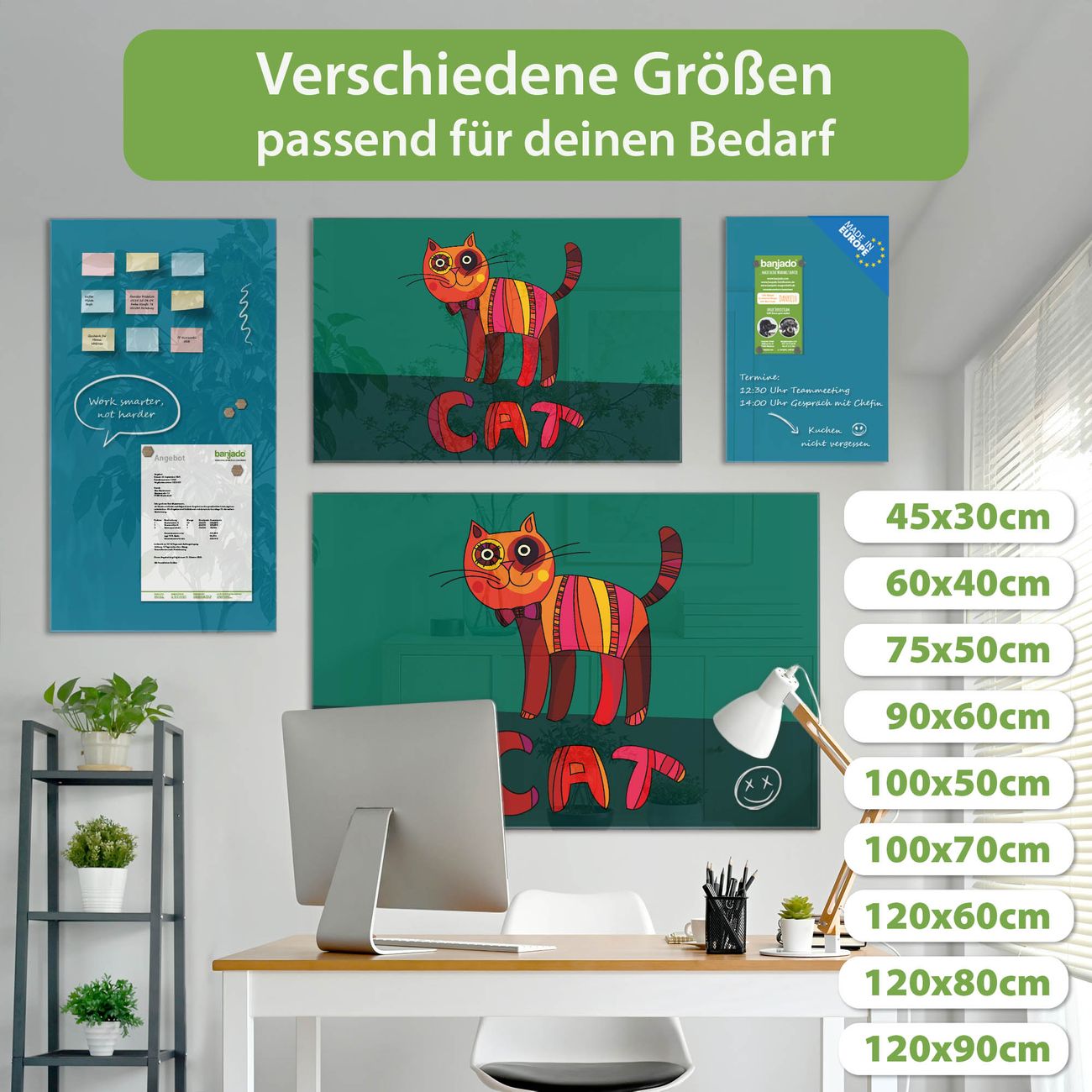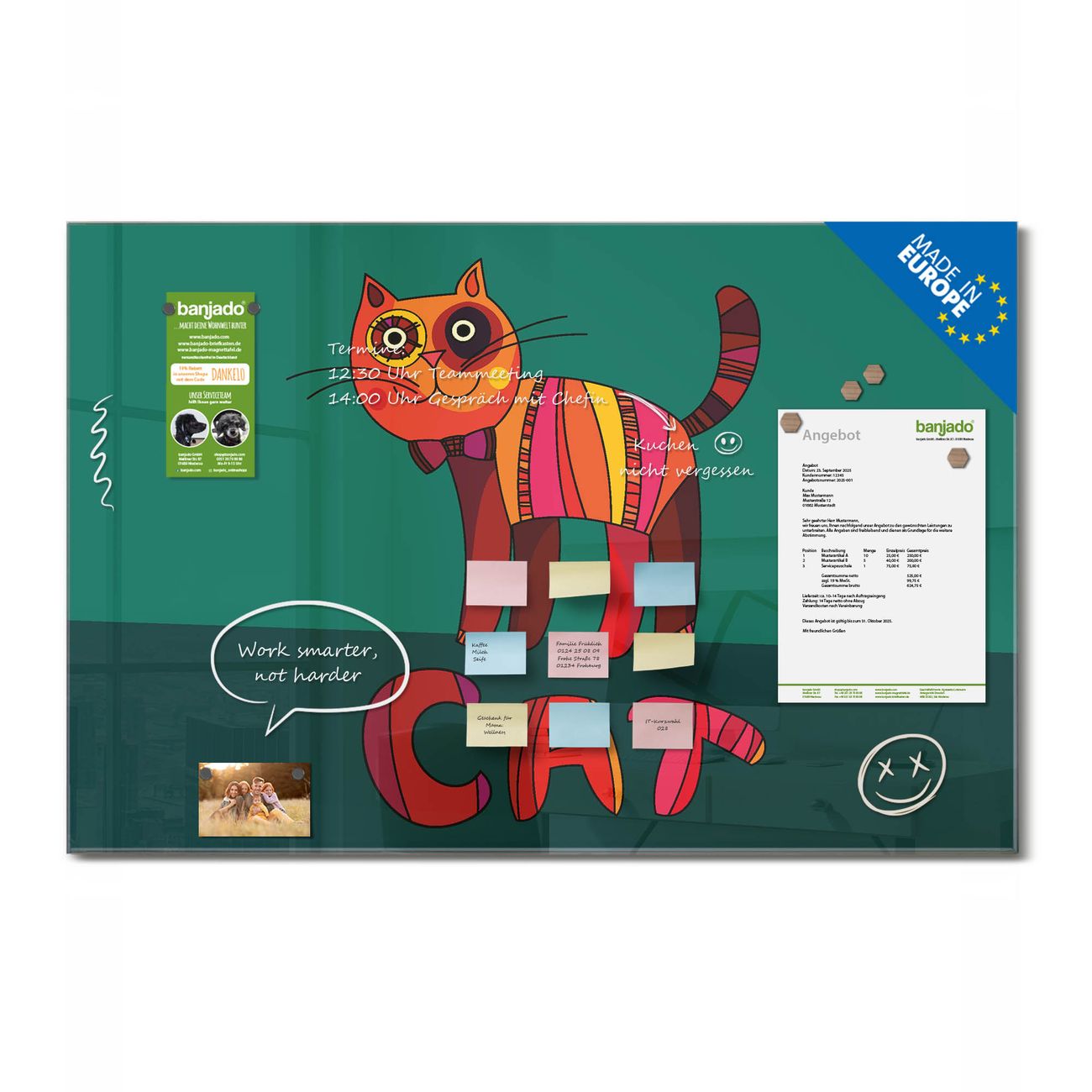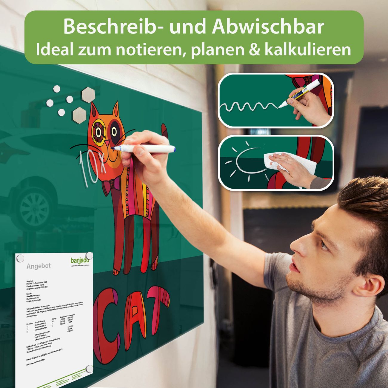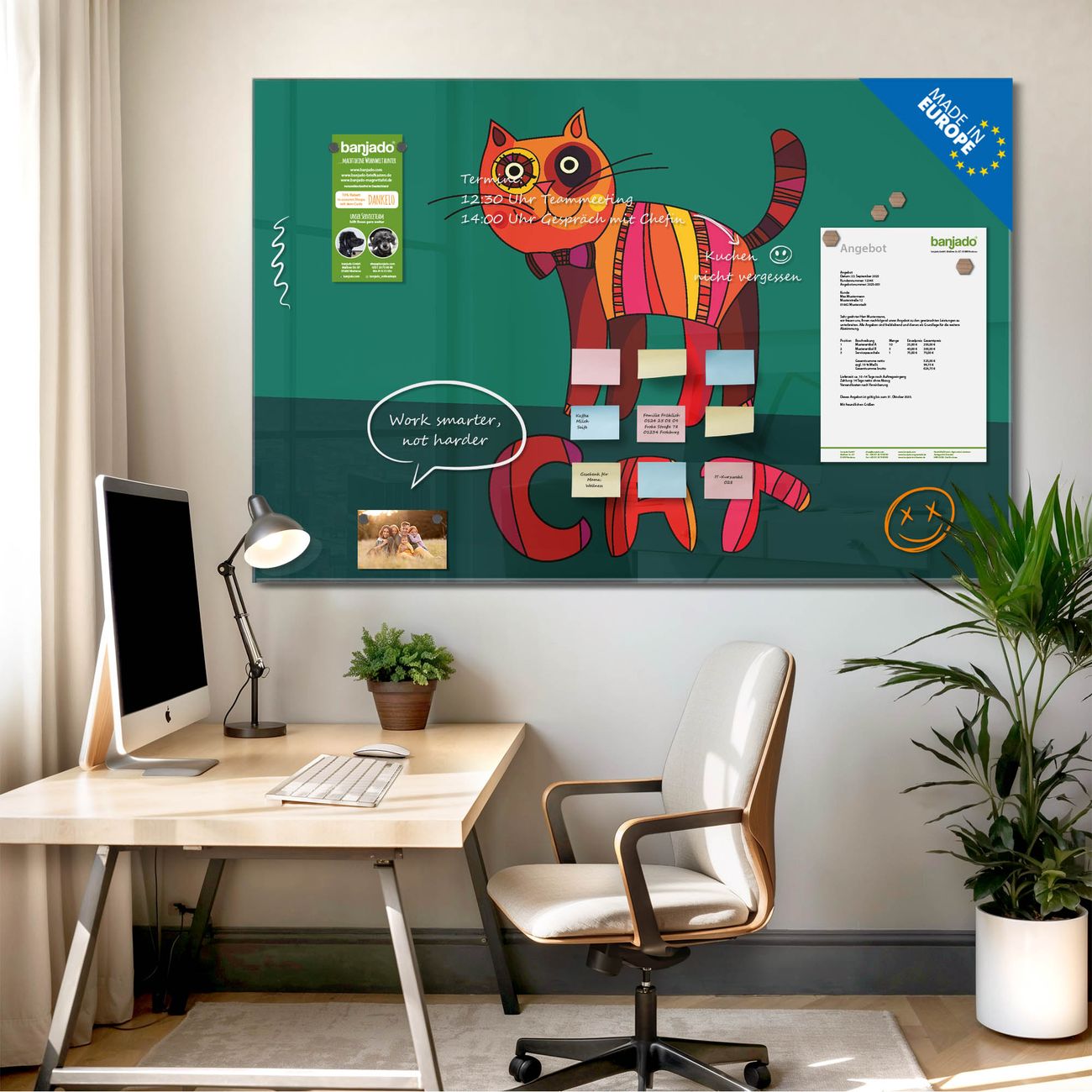 Jede Glas Magnettafel wird in unserer Werkstatt von Hand gefertigt und sorgfältig geprüft. So erhalten Sie ein echtes Qualitätsprodukt, das Funktion und Ästhetik perfekt vereint.?? Warum banjado?