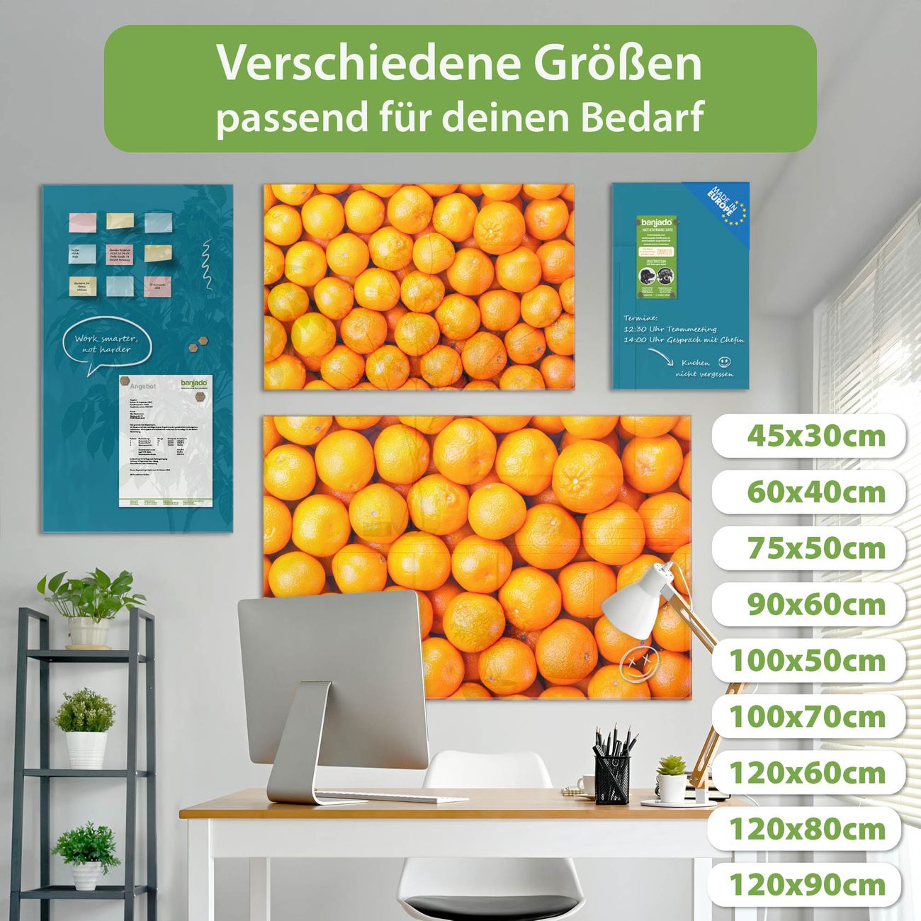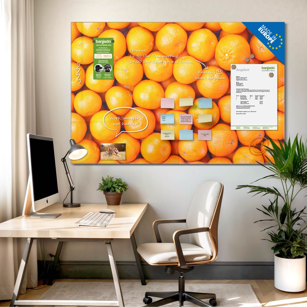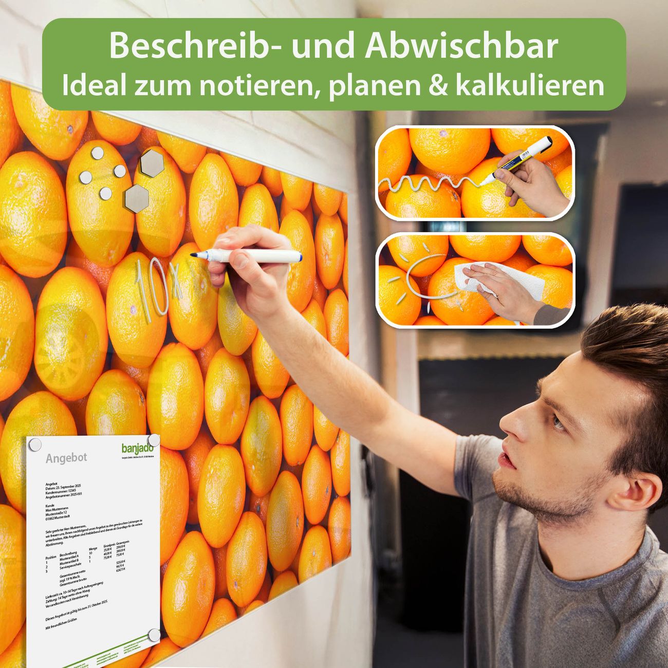 Ein Stück Design, das Ihren Alltag organisiert. Schreiben, heften, inspirieren - alles an einem Ort. Qualität, die man spürt. Montage leicht gemacht. Handwerk mit Herz - veredelt in Sachsen. Einzigartiges Design mit Motiv Motiv Orangen Beschreibbare Glasoberfläche, leicht zu reinigen Starke Magnetkraft durch Stahlrückwand Inklusive 4 Neodym-Magneten Flexible Montageoptionen Handveredelt in Sachsen - Qualität, die bleibt