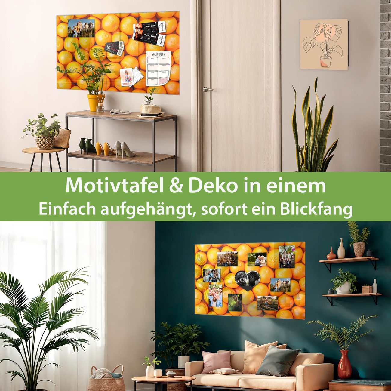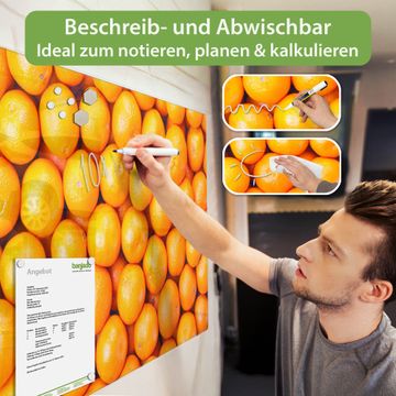 Die banjado Glas Magnettafel mit dem Motiv Motiv Orangen verbindet Funktionalität mit Stil. Sie ersetzt das Zettelchaos durch klare Strukturen und bringt dabei eine warme, natürliche Atmosphäre in Ihr Zuhause. Ob im Büro, in der Küche oder im Eingangsbereich - dieses Design-Board zieht Blicke an und sorgt für Ordnung mit Charakter.