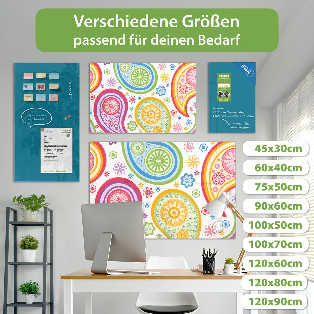 Ein Stück Design, das Ihren Alltag organisiert. Schreiben, heften, inspirieren - alles an einem Ort. Qualität, die man spürt. Montage leicht gemacht. Handwerk mit Herz - veredelt in Sachsen. Einzigartiges Design mit Motiv Motiv Paisley bunt Beschreibbare Glasoberfläche, leicht zu reinigen Starke Magnetkraft durch Stahlrückwand Inklusive 4 Neodym-Magneten Flexible Montageoptionen Handveredelt in Sachsen - Qualität, die bleibt