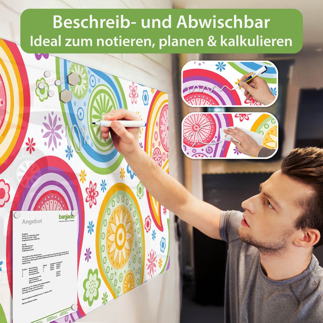 Jede Glas Magnettafel wird in unserer Werkstatt von Hand gefertigt und sorgfältig geprüft. So erhalten Sie ein echtes Qualitätsprodukt, das Funktion und Ästhetik perfekt vereint.?? Warum banjado?